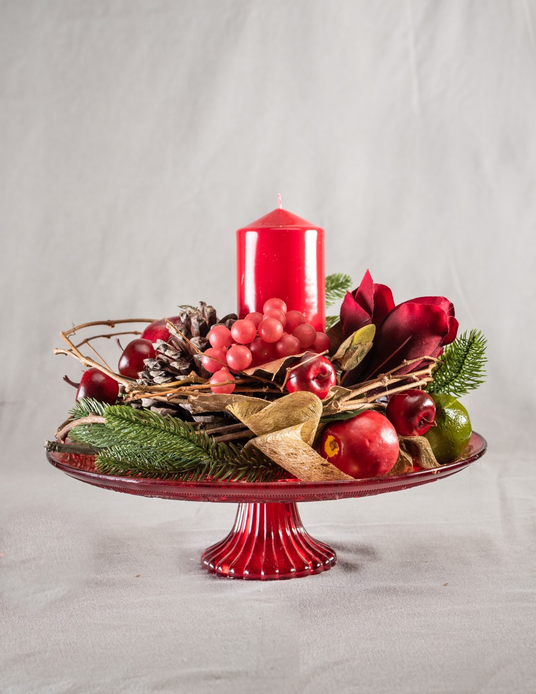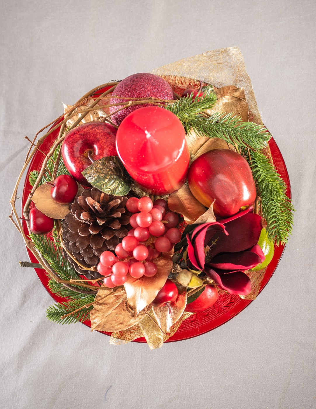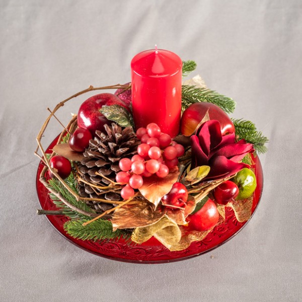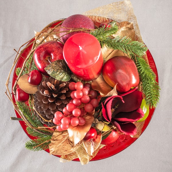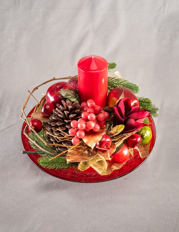 D=30 cm. Veidots sarkanā stikla traukā .No kvalitatīviem mākslīgiem un dabas materiāliem vienā eksemplārā.