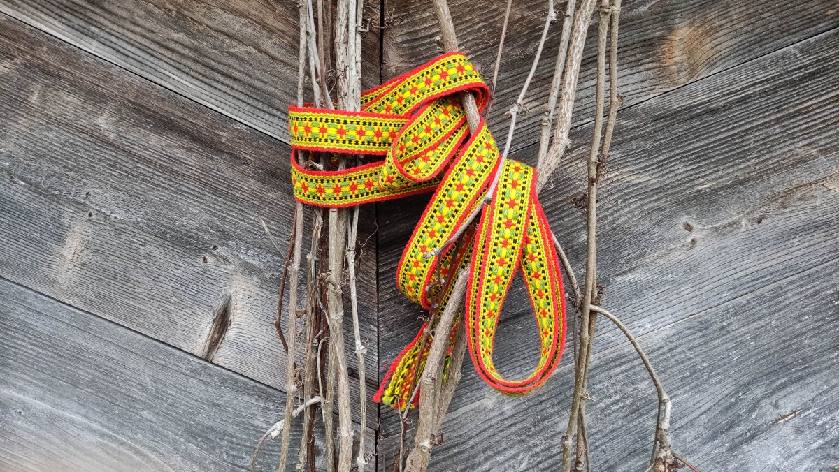 Jaunpiebalgas tautiskā ziedainā josta sarkanā, dzeltenā, zaļā un melnā krāsu salikumā. Austa pēc muzeja parauga.