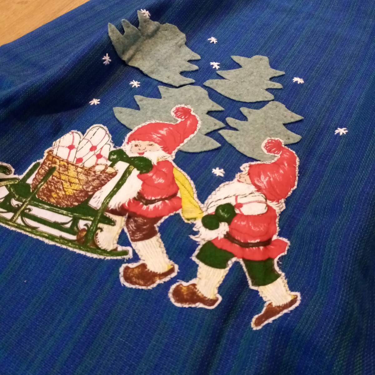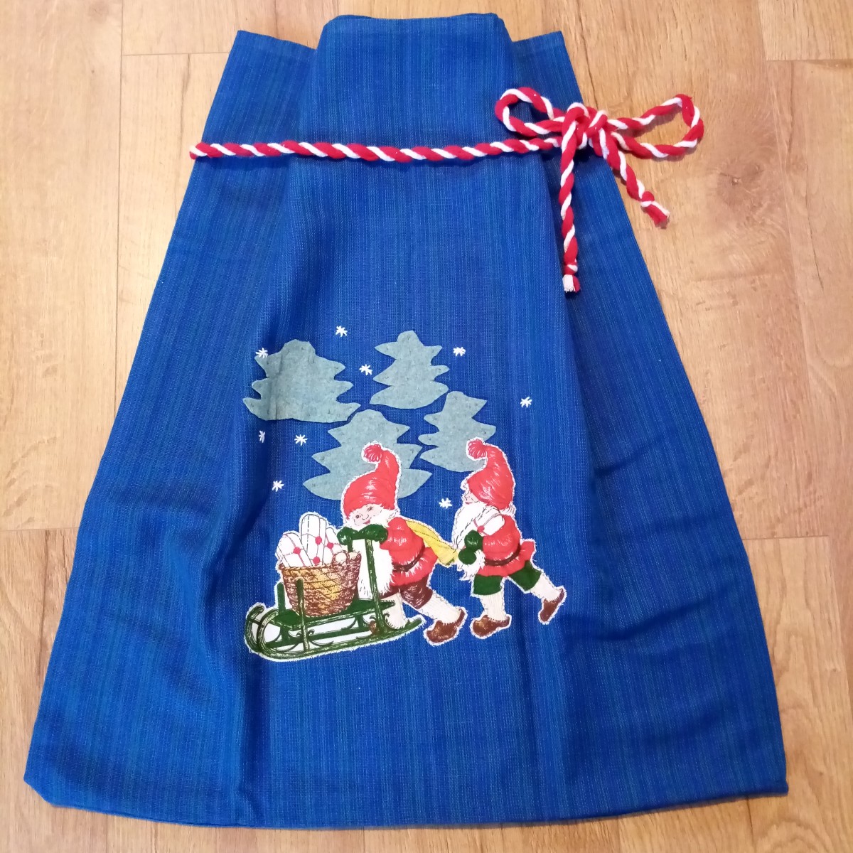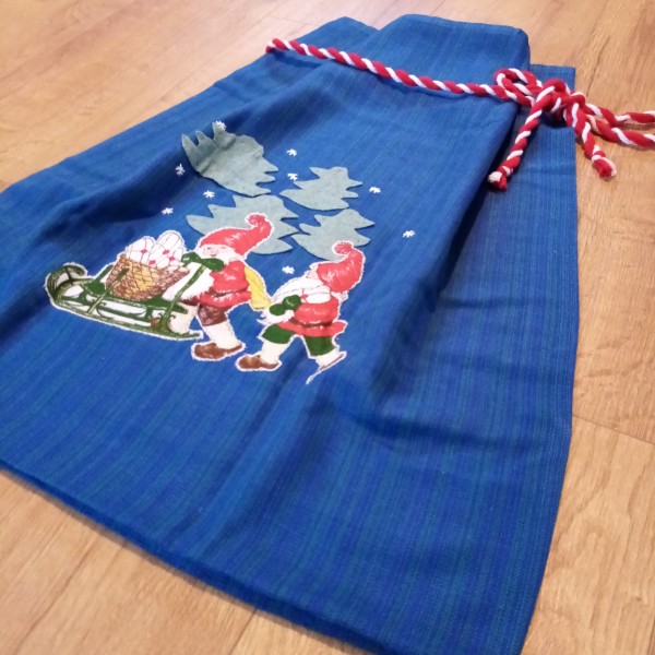 No auduma šūts dāvanu maiss ar aplikāciju rotājumu. Izmērs : 67 x 58 cm (zilais), 77 x 52 cm ( pelēkais),