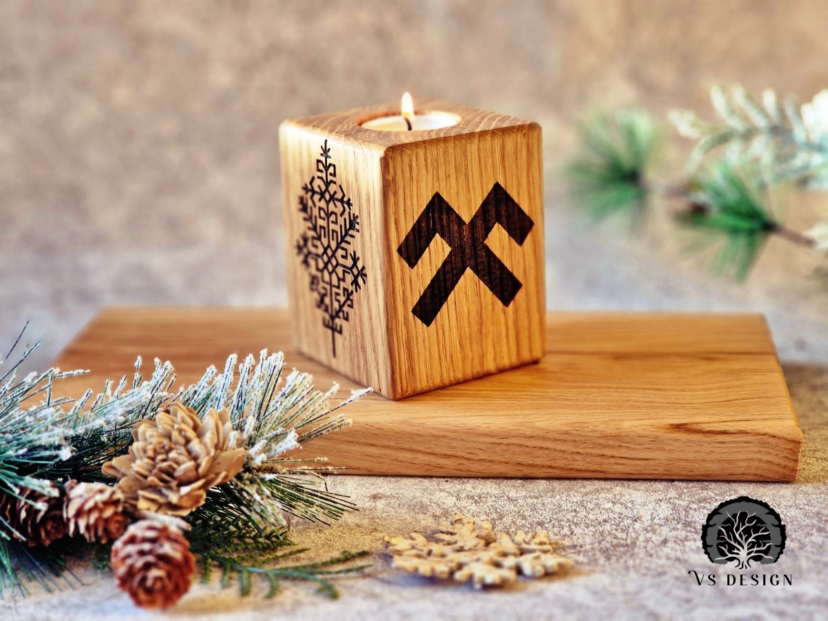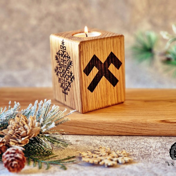 Uz svečtura 4 pusēm iegravētas latviešu spēka zīmes: