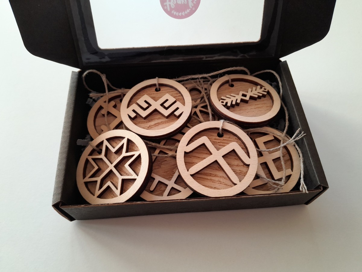 Koka rotājumu komplekts ar latvju rakstu zīmēm.