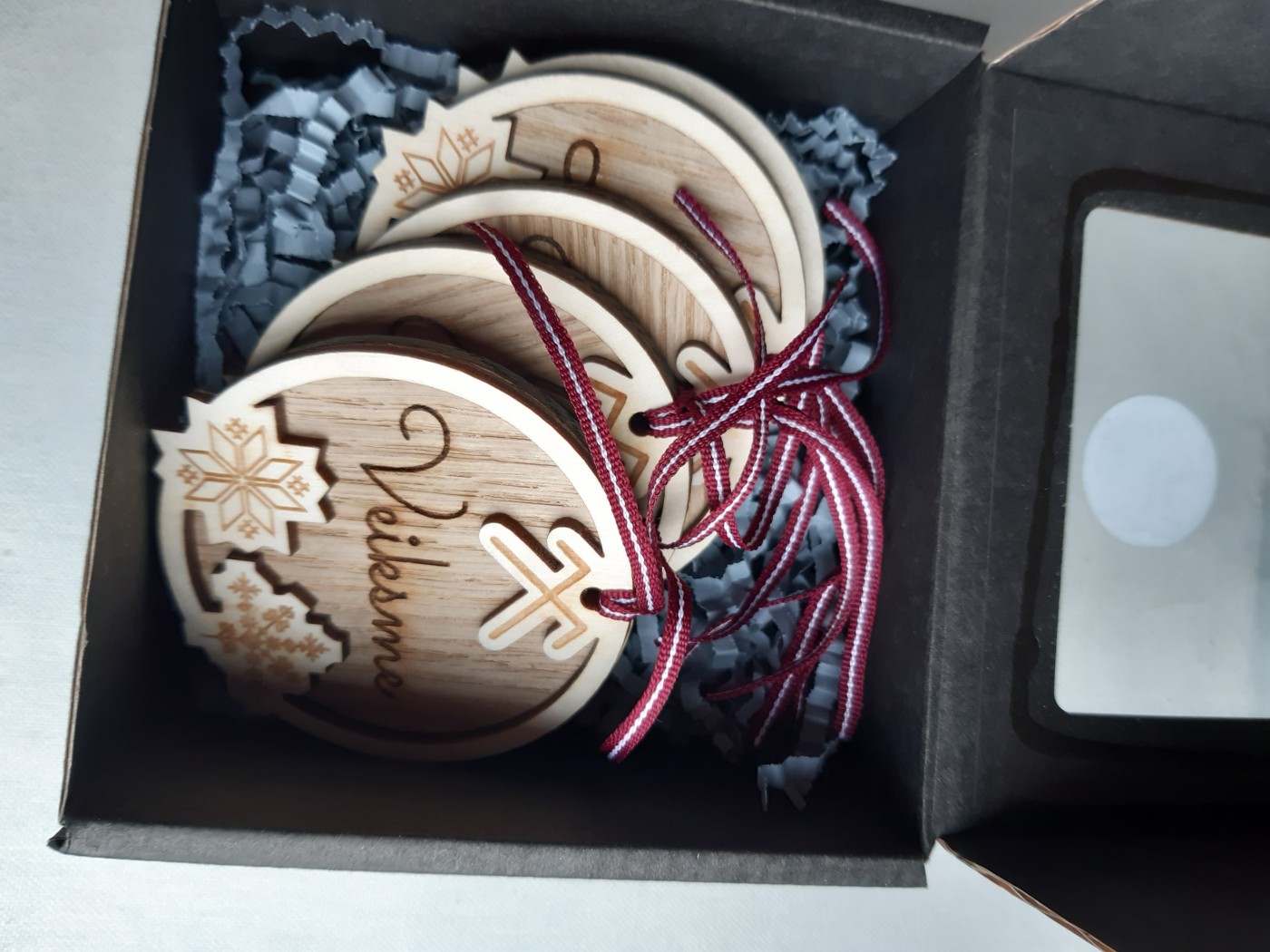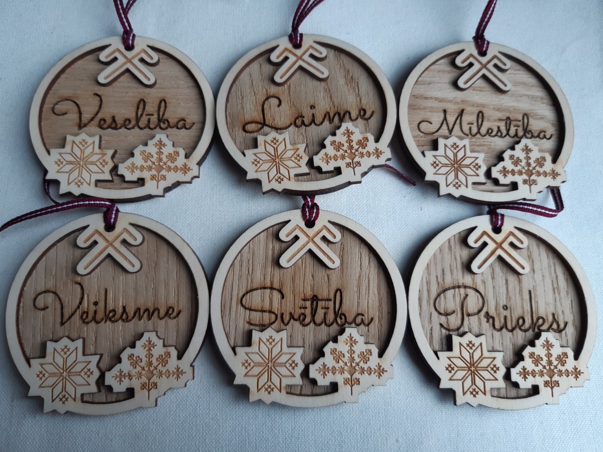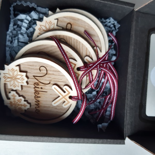 Koka rotājumu komplekts ar gravējumu.