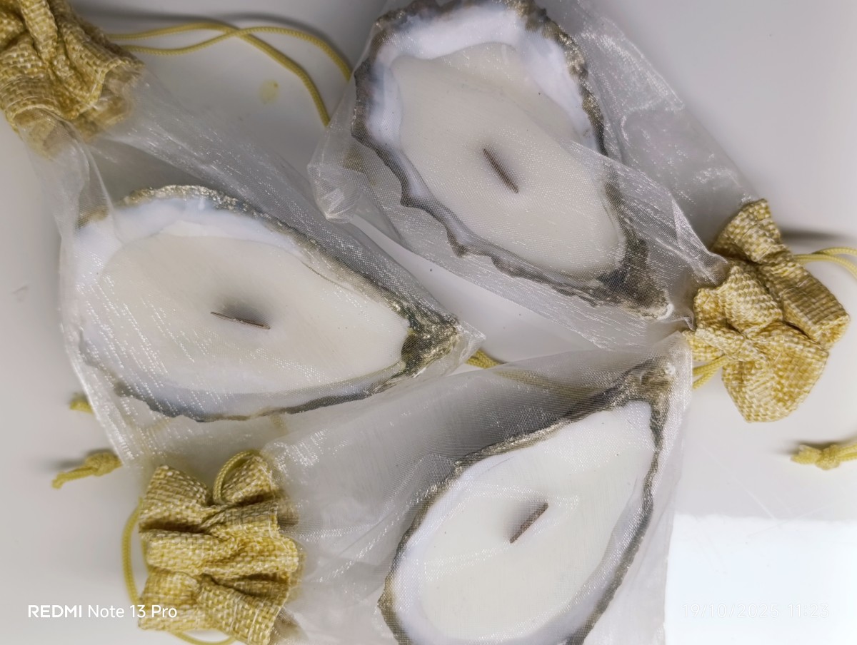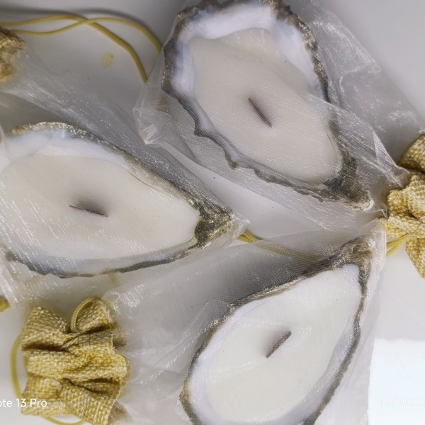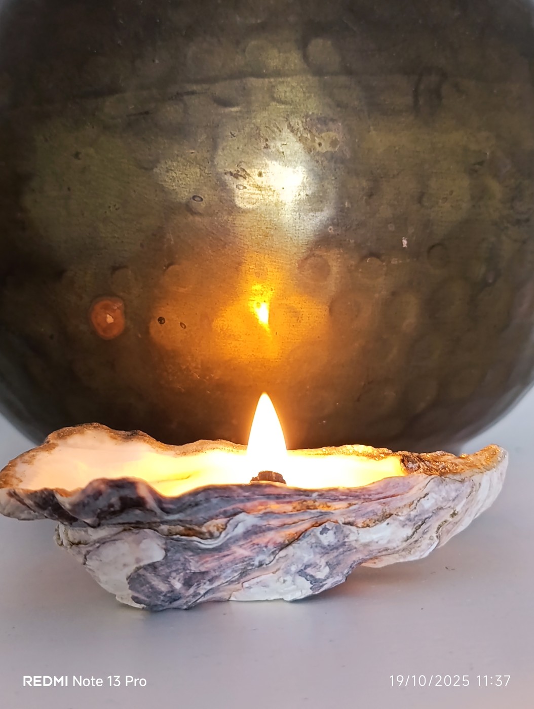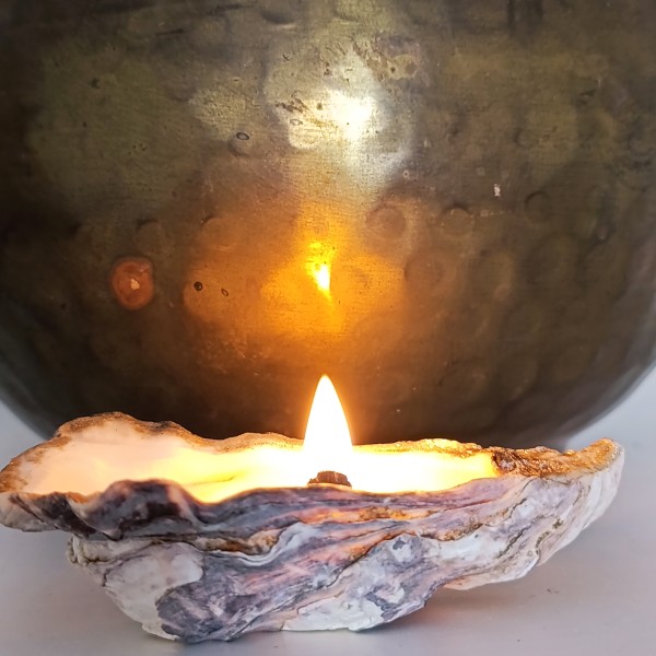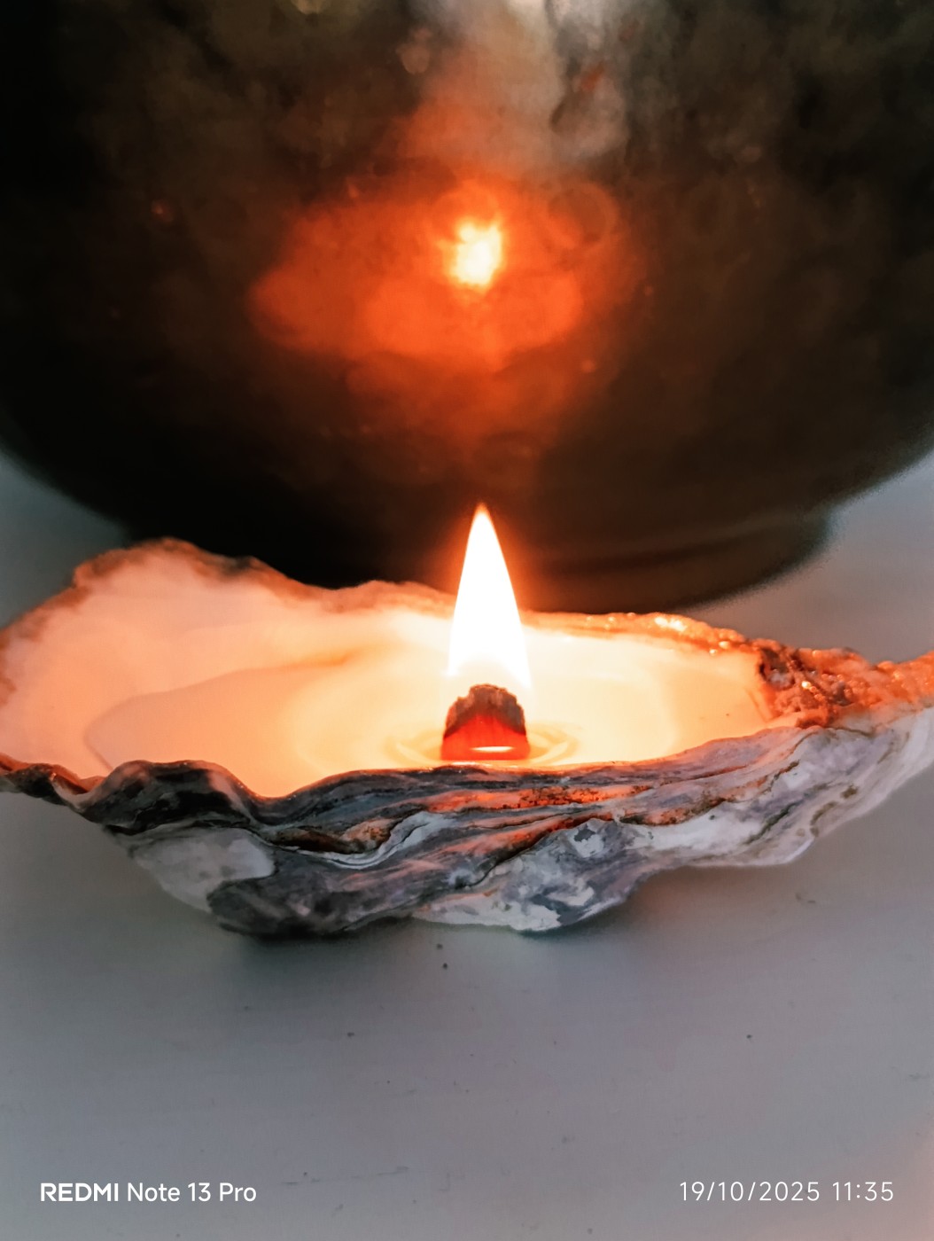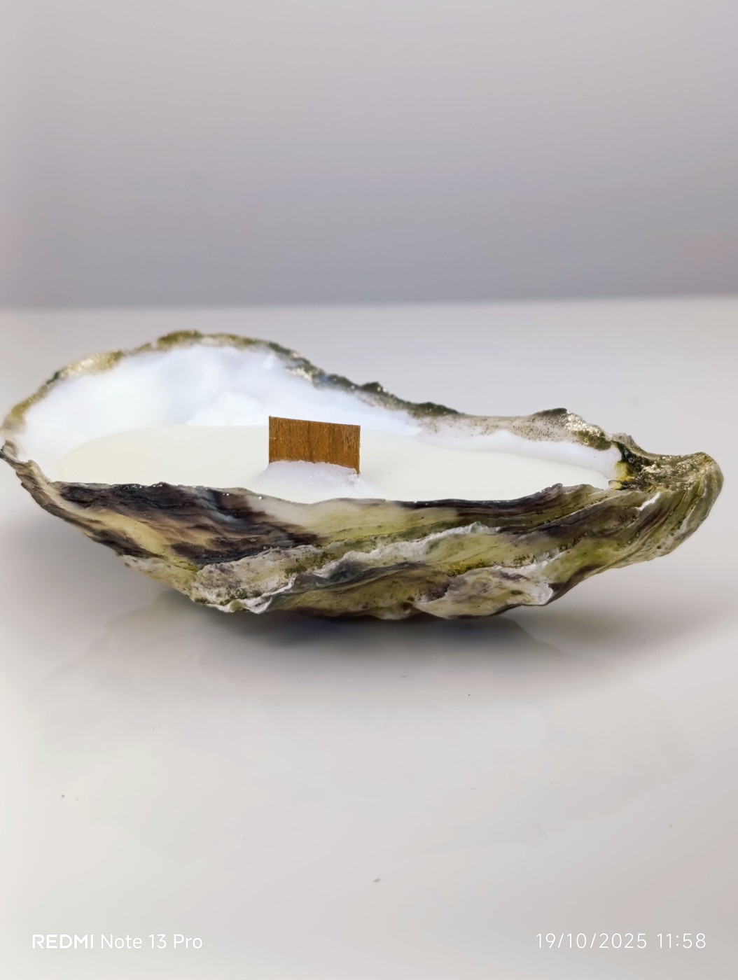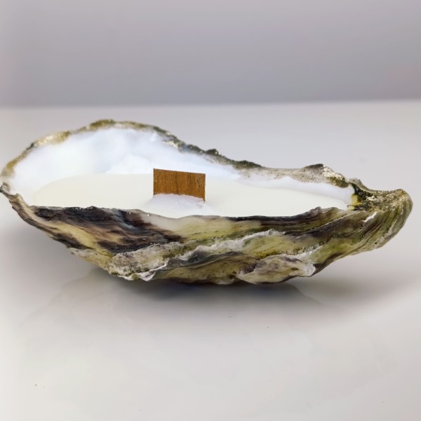 Dabīgs Austeres gliemežvāks, pildīts ar ekoloģisku sojas vasku. Koka dakts deg ar spēcīgu liesmu un sprakšķ gandrīz kā kamīns