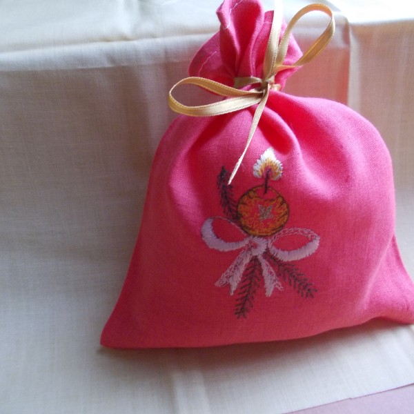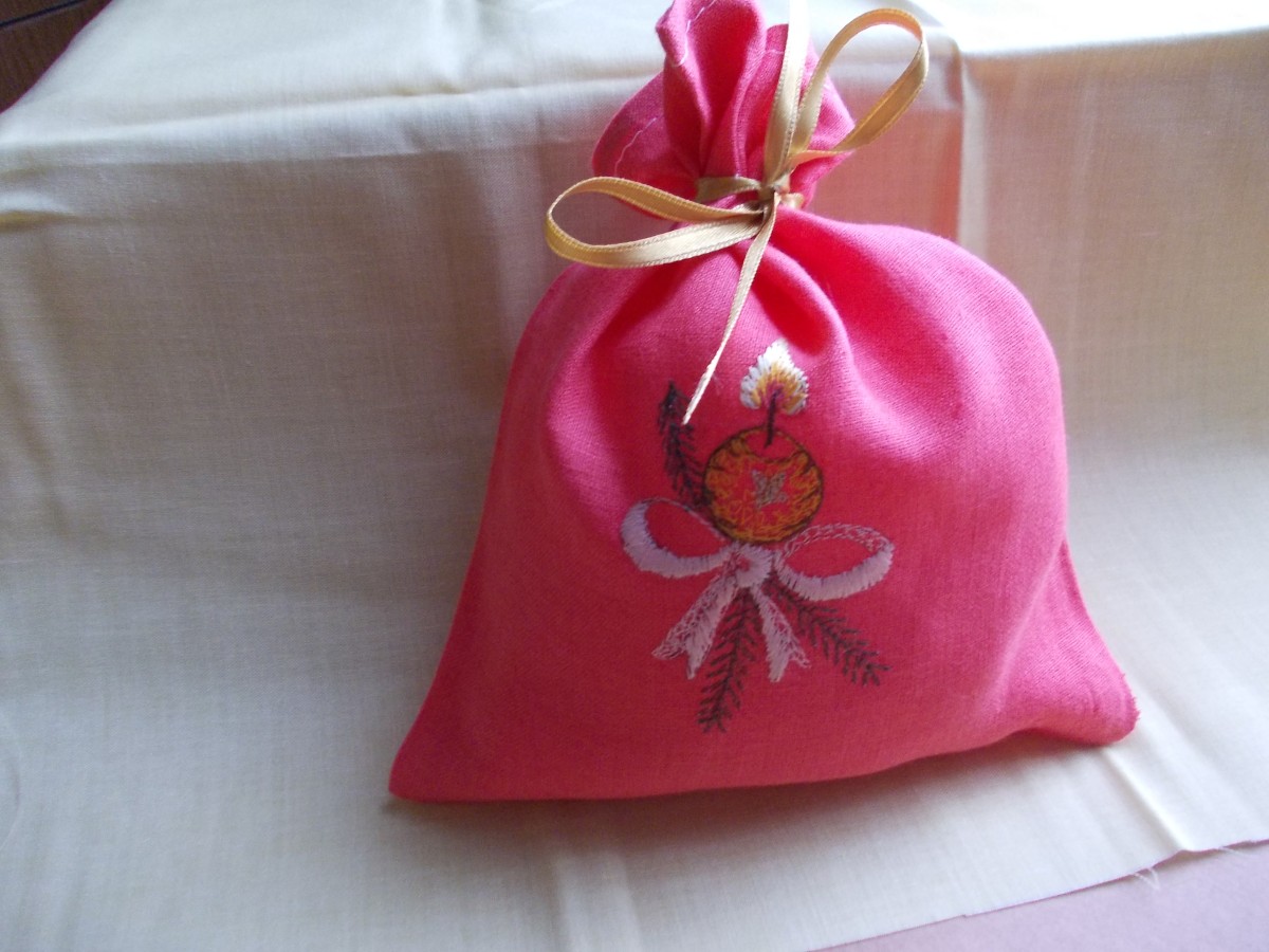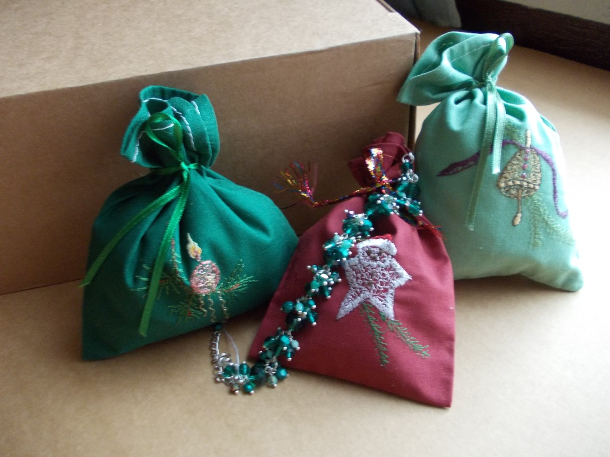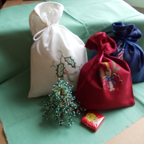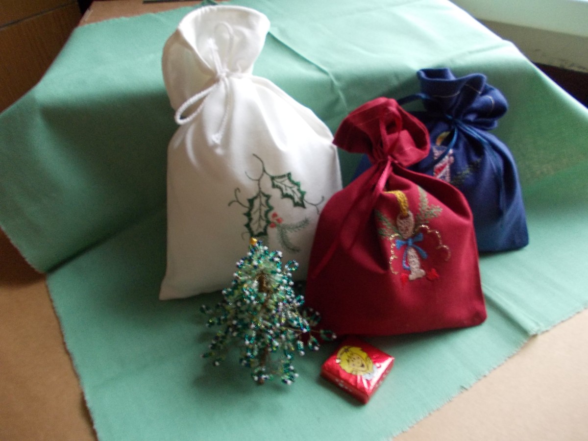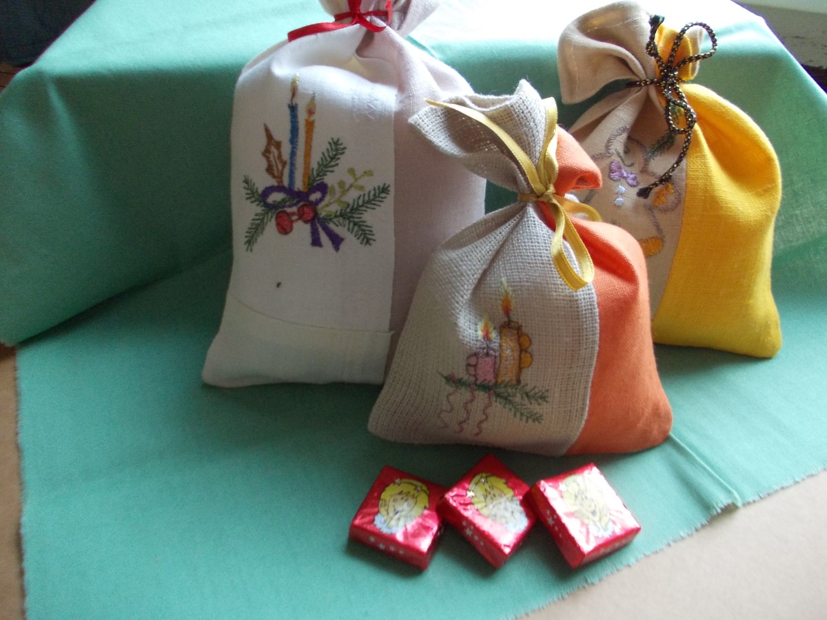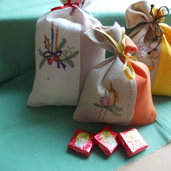 Roku darbs - Izšūti maisiņi dāvanu iesaiņošanai, saldumiem, lina un kokvilnas audumi, zīda diega izšuvums, izmēri 34x24 un 30x21 cm saldumu maisiņiem, pārējie trīs veidi - lielie, vidējie un mazie. cena 12.00 eiro un no 5.00 - 10.00 eiro.