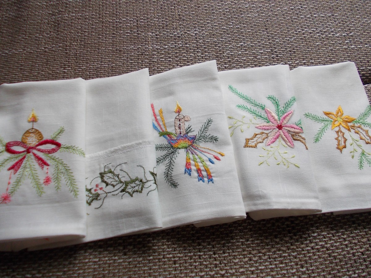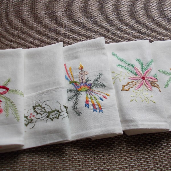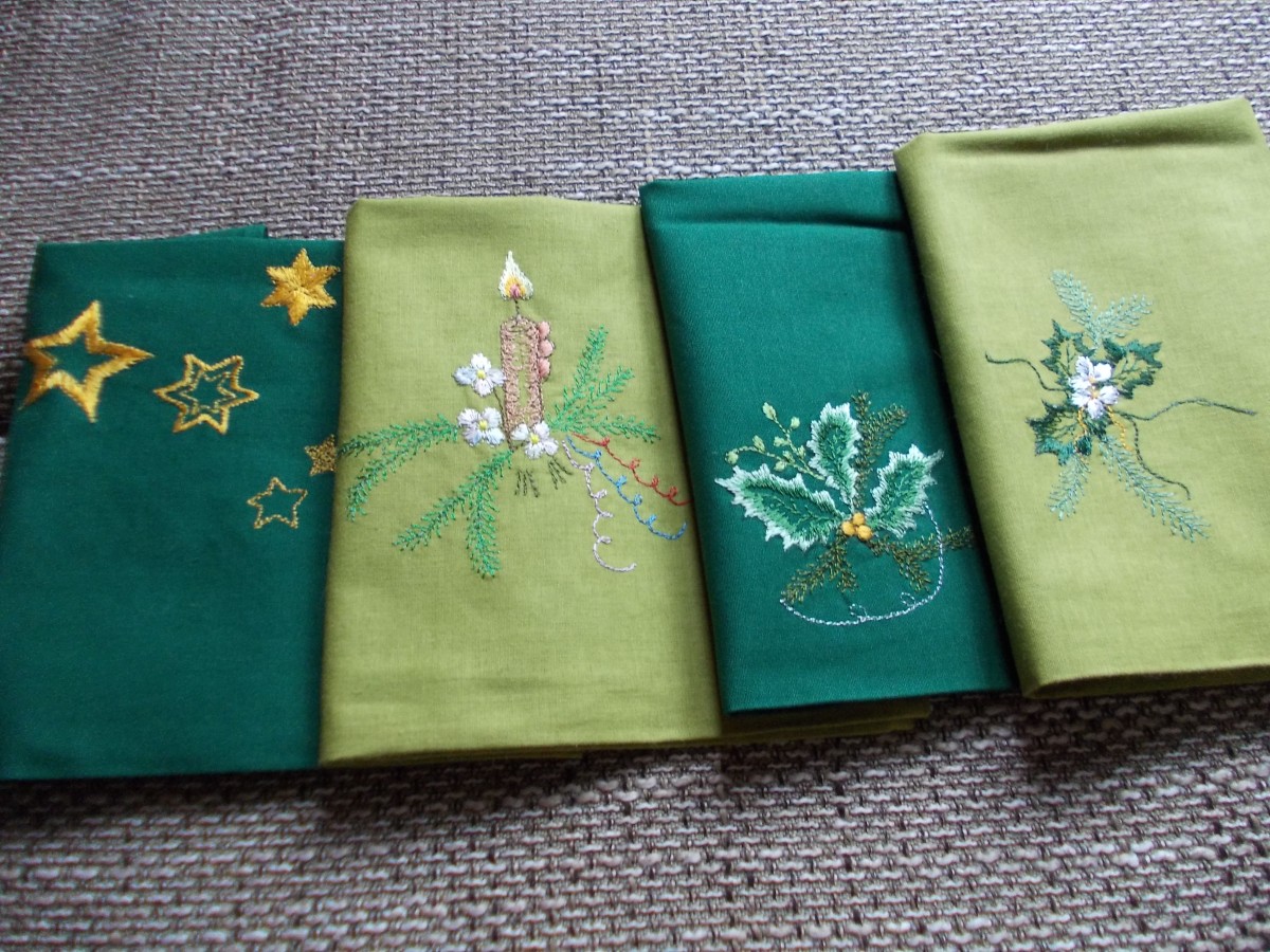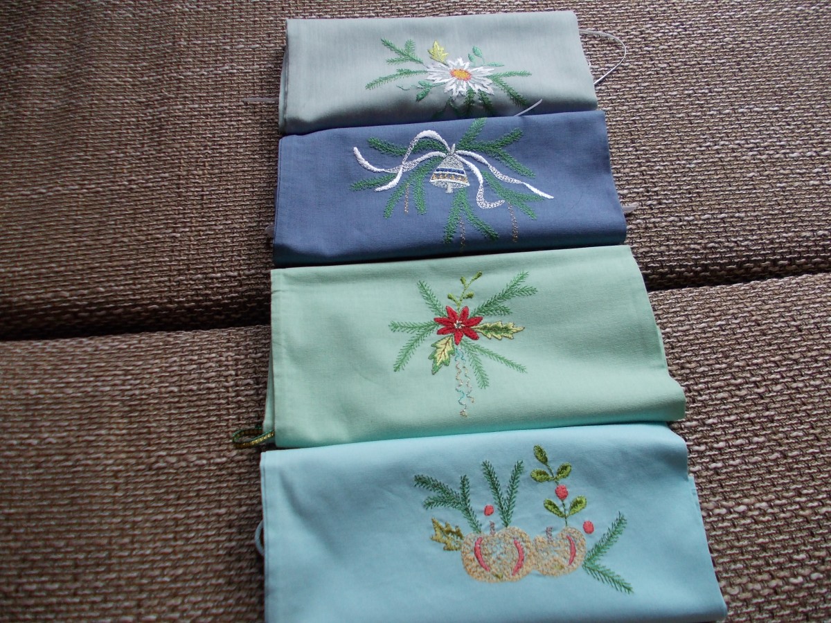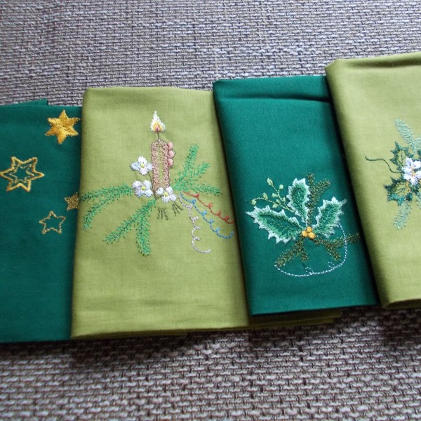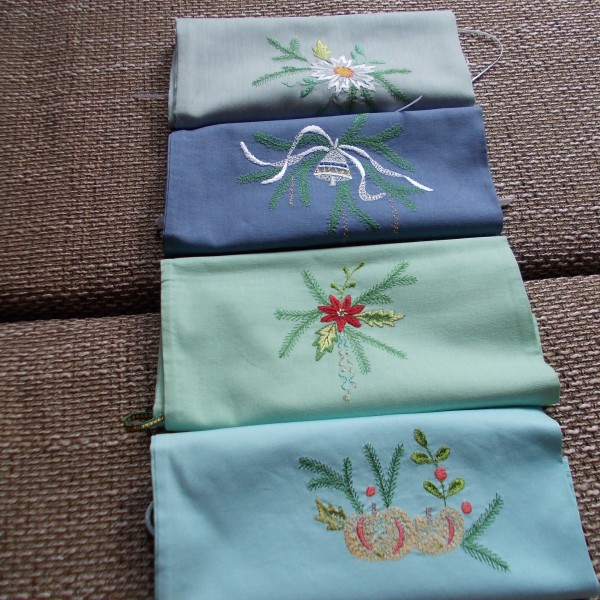 Roku darbs - kokvilnas maisiņi sašūti ar dubultšuvi, lai diegi nenokļūtu saldumos. Izšūts ar zīda diegiem, autores zīmējumi,