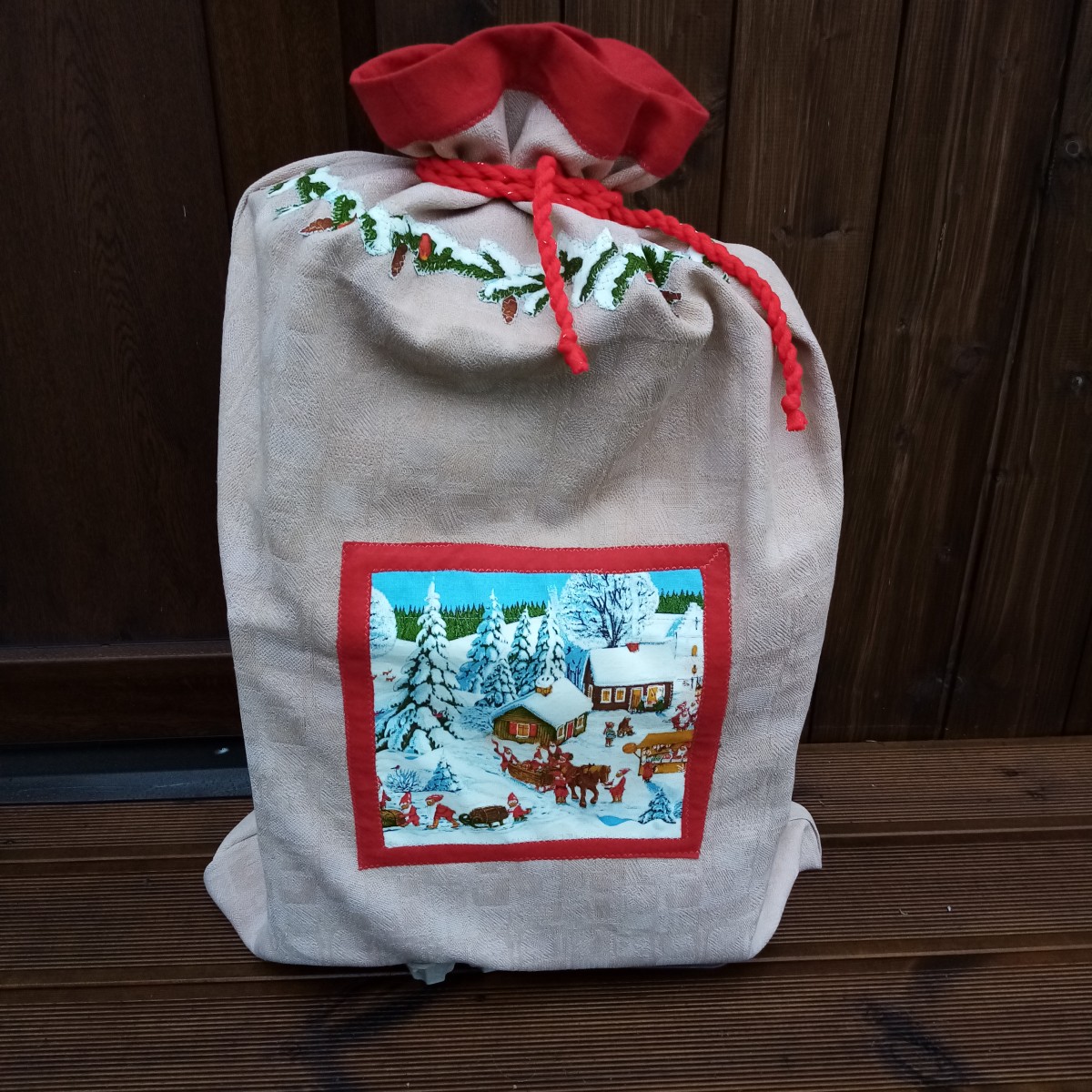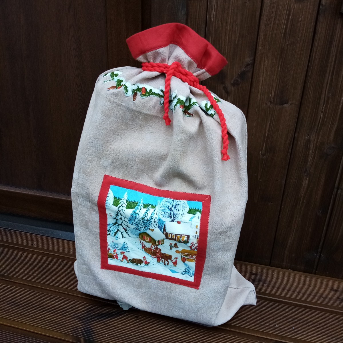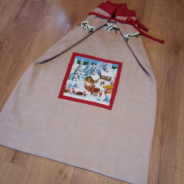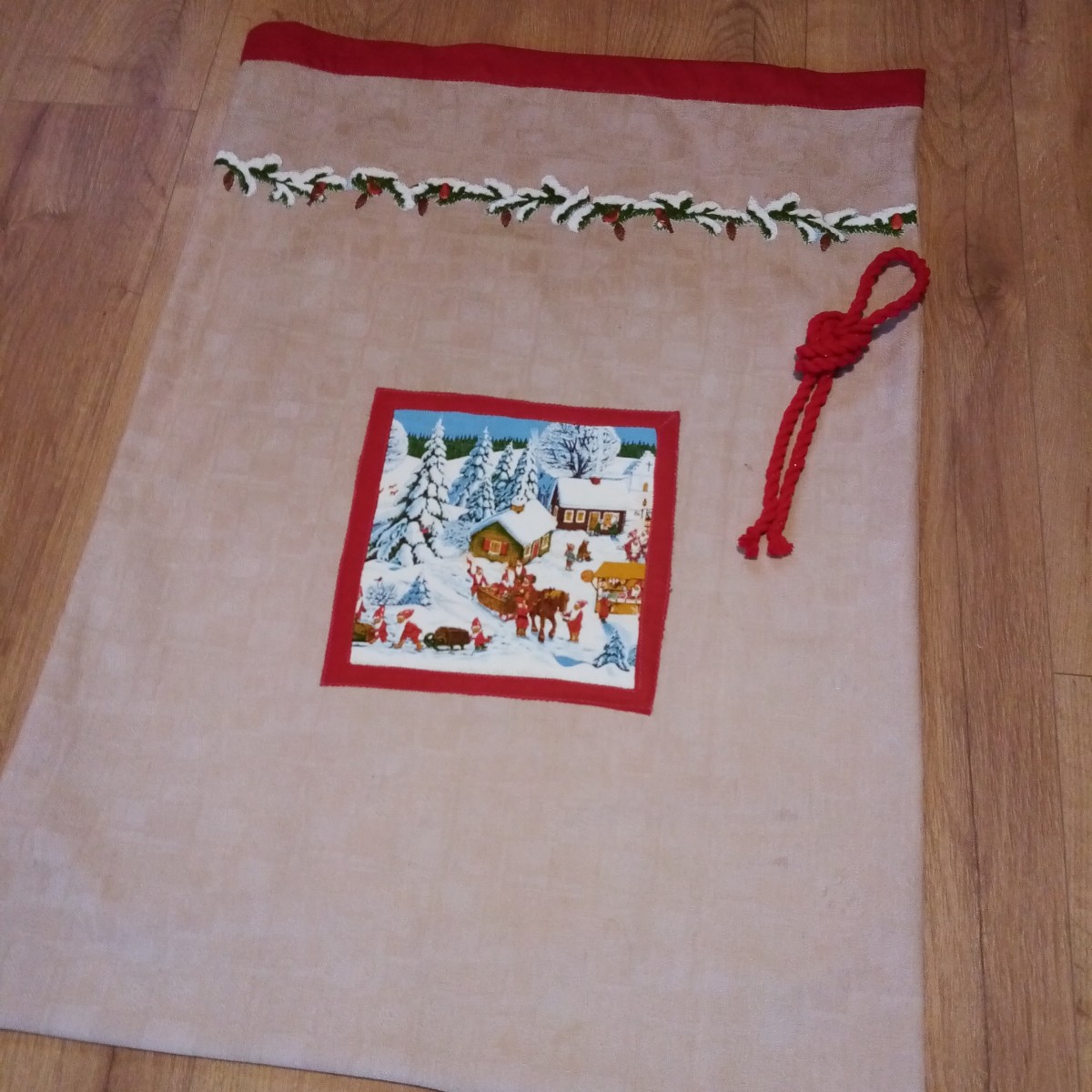 No auduma šūts liels dāvanu maiss ar tematisku aplikācijas rotājumu. 92 cm x 67 cm. Otrs ar līdzīgu dizainu no lina auduma ir vēl lielāks 1,23 m x 0,74 m. Foto sazinoties.