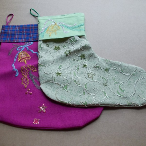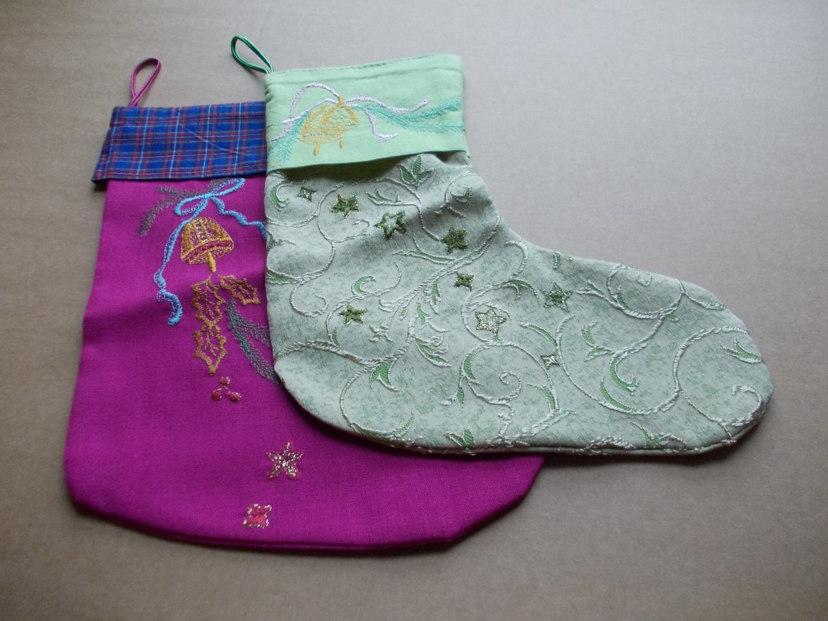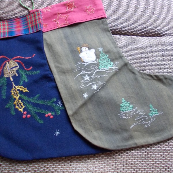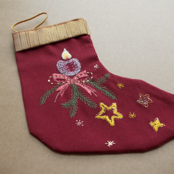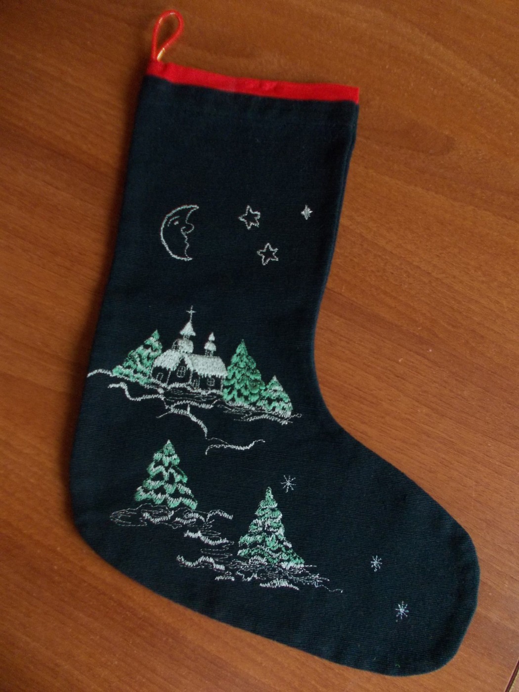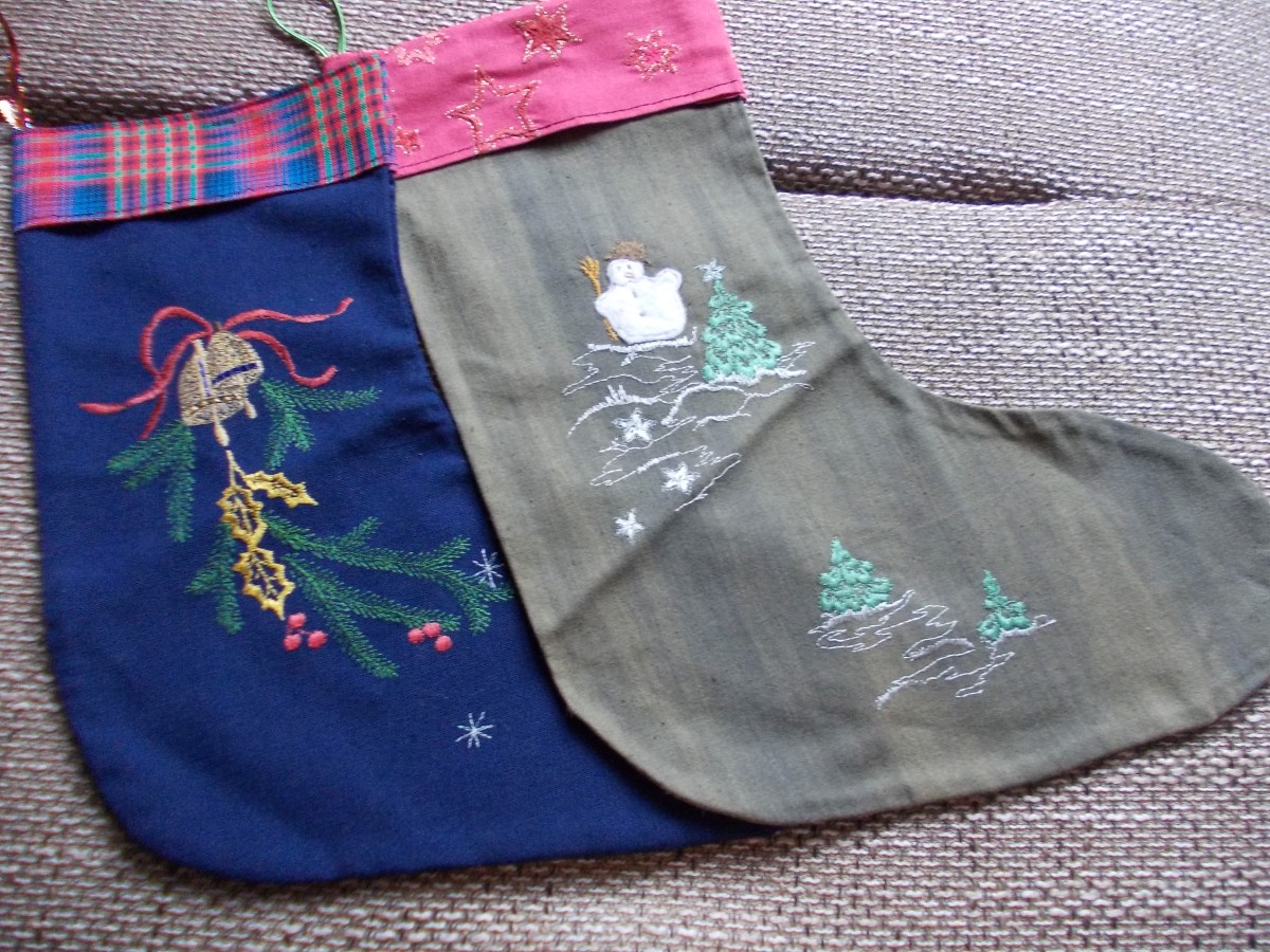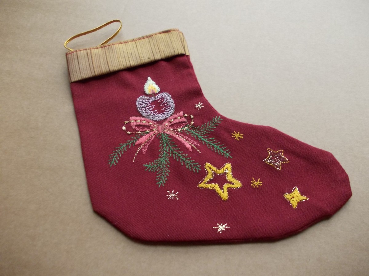 Roku darbs - auduma izšūtas zeķītes dāvanu iesaiņošanai pie eglītes. Galvenais foto kokvilnas audums - ziemas skats un baznīca fonā, cena 15.00 eiro, 1. foto - izšūts eglītes zars ar svecīti, vilnas audums , cena 12.00 eiro, 2. foto, pusvilnas un kartūna audums ar atloku ,