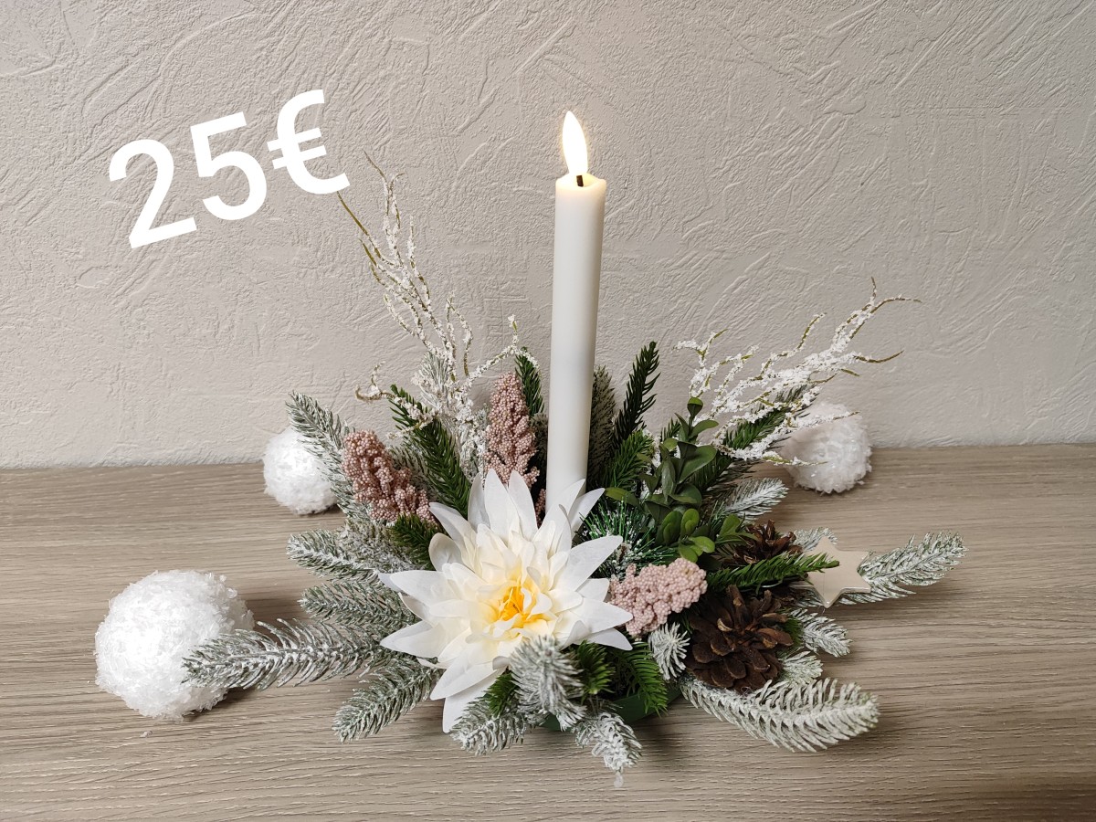 Kompozīcija veidota no mākslīgiem materiāliem. Kalpos ilgi. Svece- elektriskā.