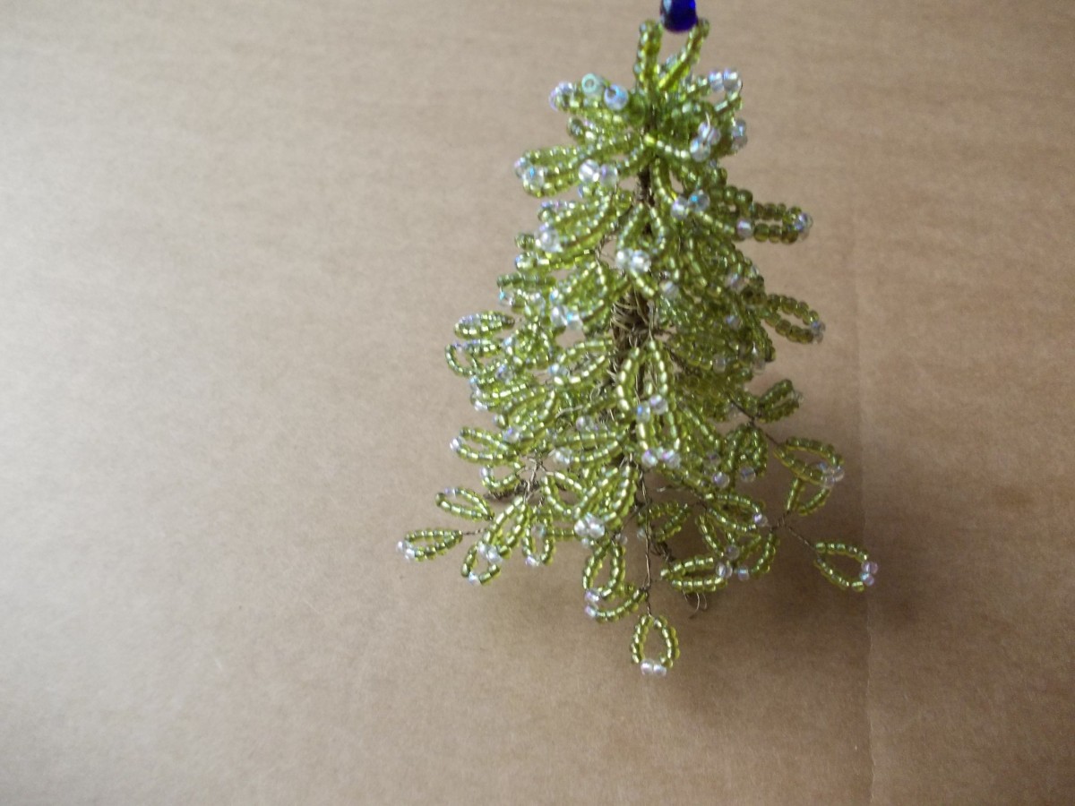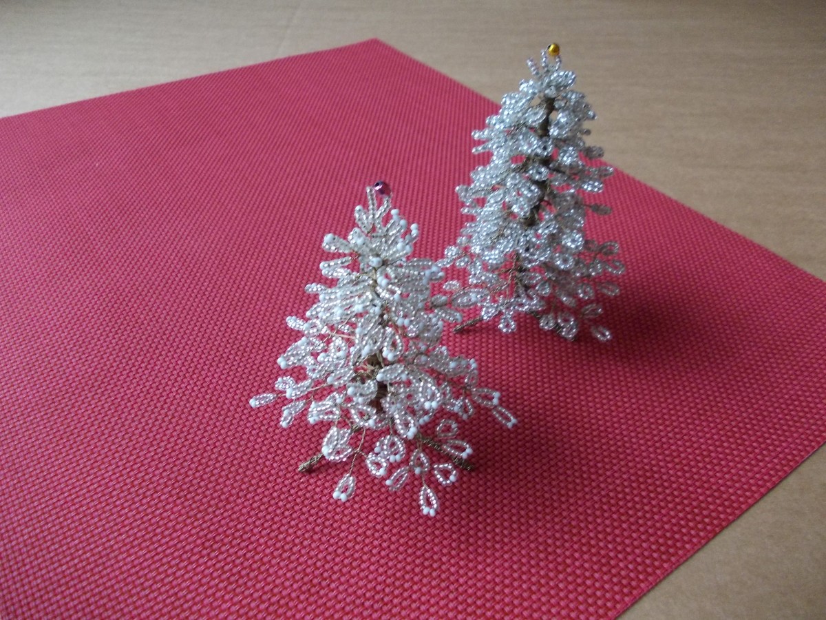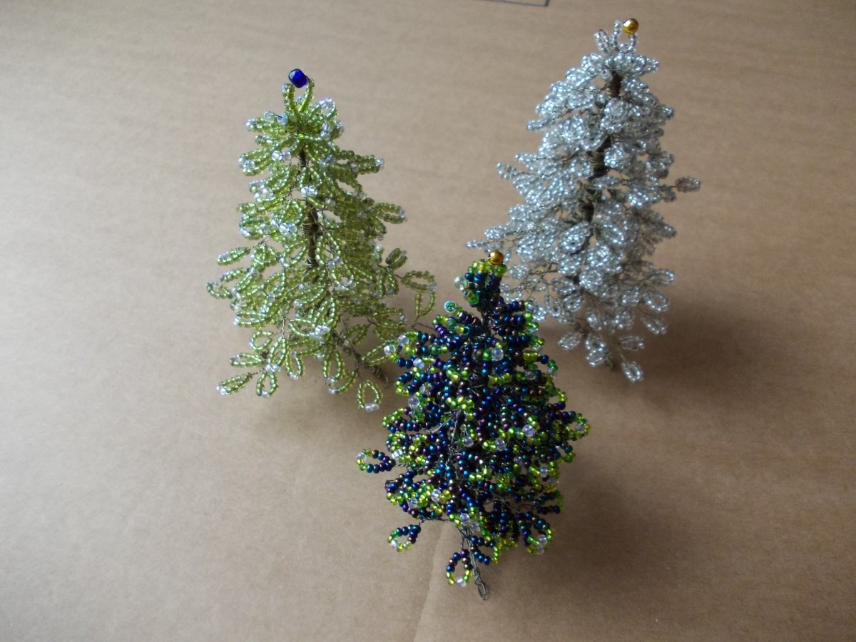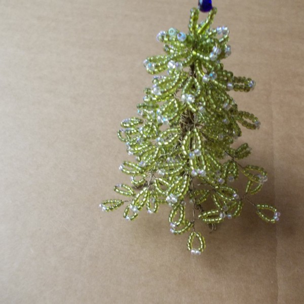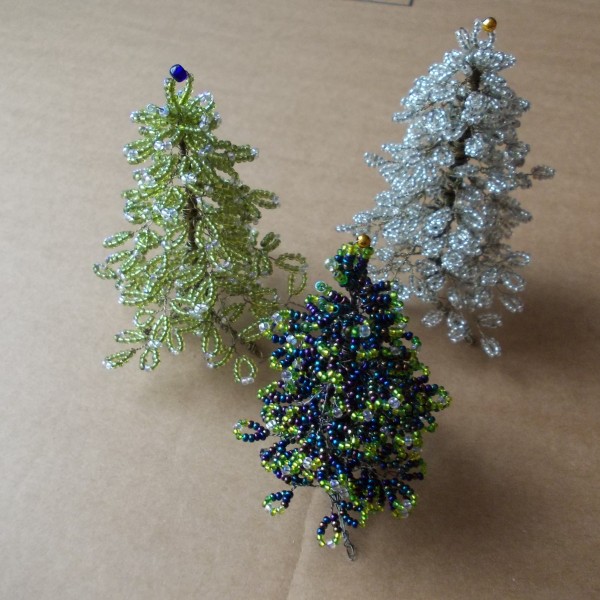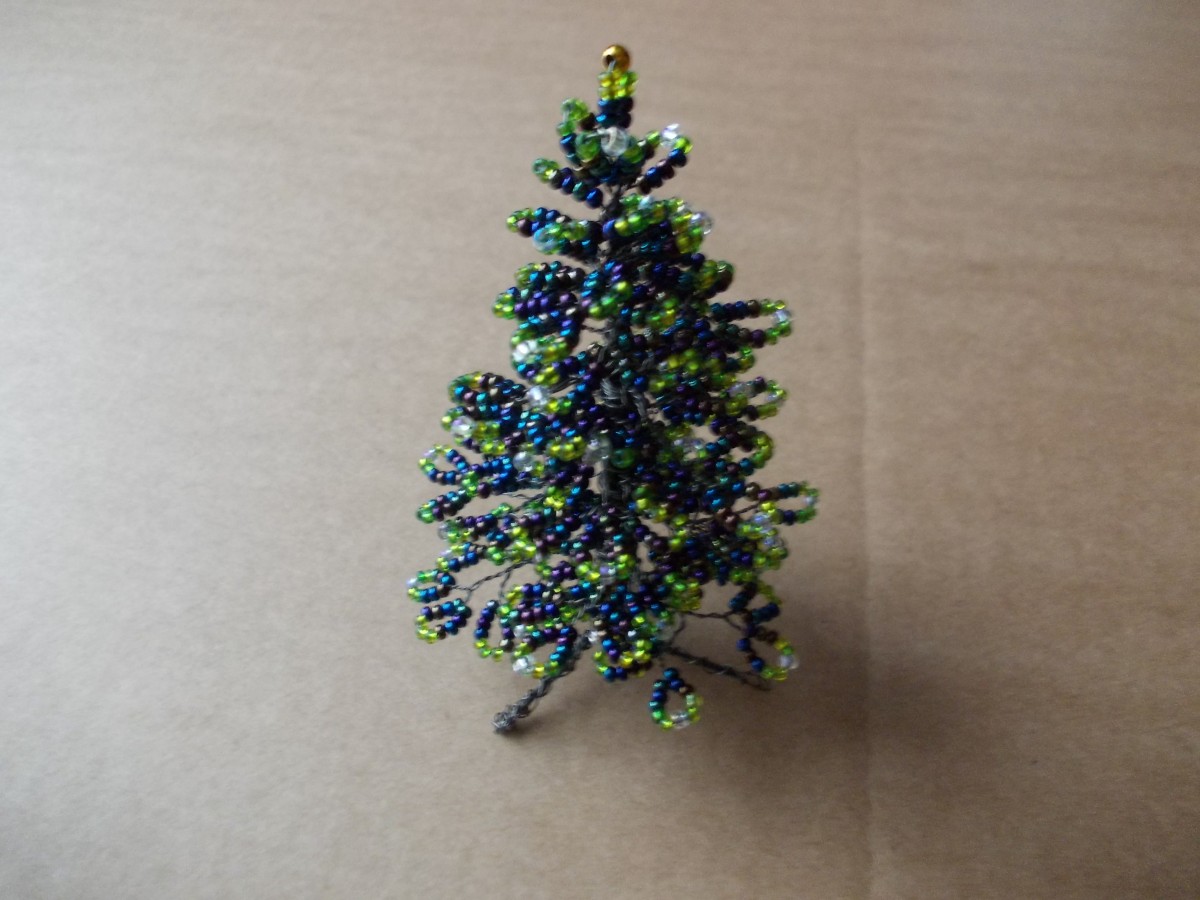 Roku darbs, izmantota vara drāts un čehu pērlītes, pītas atsevišķas deteļas, kuras pēc tam simetriski savienotas kokā.