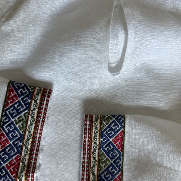 Kreklam tunikveida piegriezuma ar vaļējiem dūrgaliem ir darināta no 100% lina auduma izšuts ar viskozes diegiem. izšuvuma krāsas - dzeltens, zils, zaļš, sarkans.