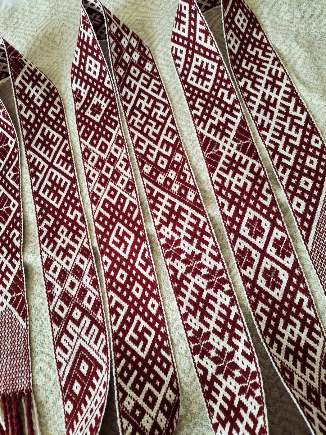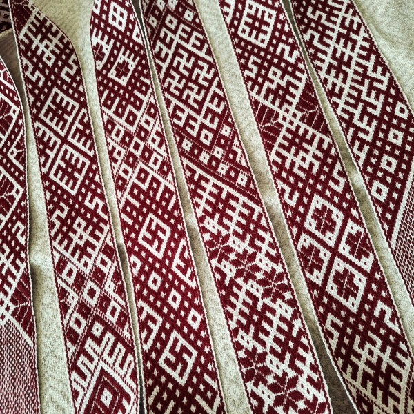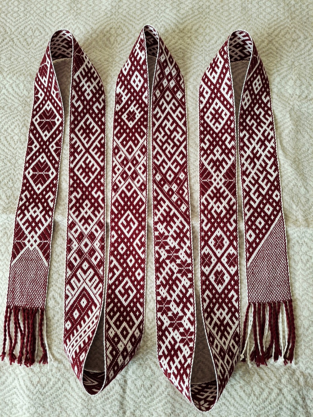 Lielvārdes rakstu josta. Austa no vilnas dzijas, lina. Josta 6,5 cm plata, 3,7 m gara.