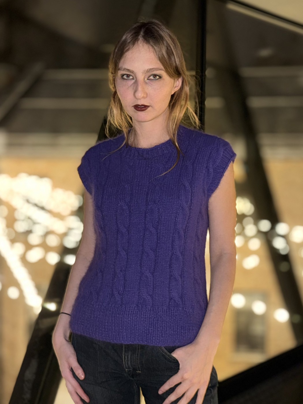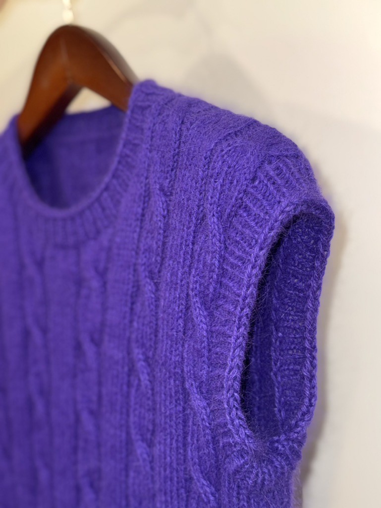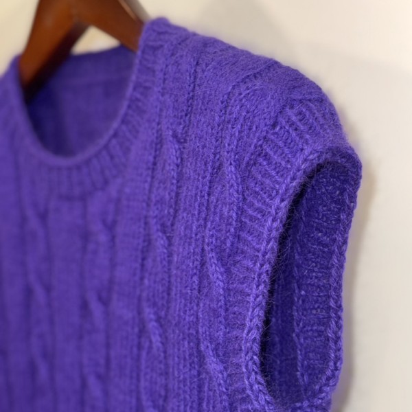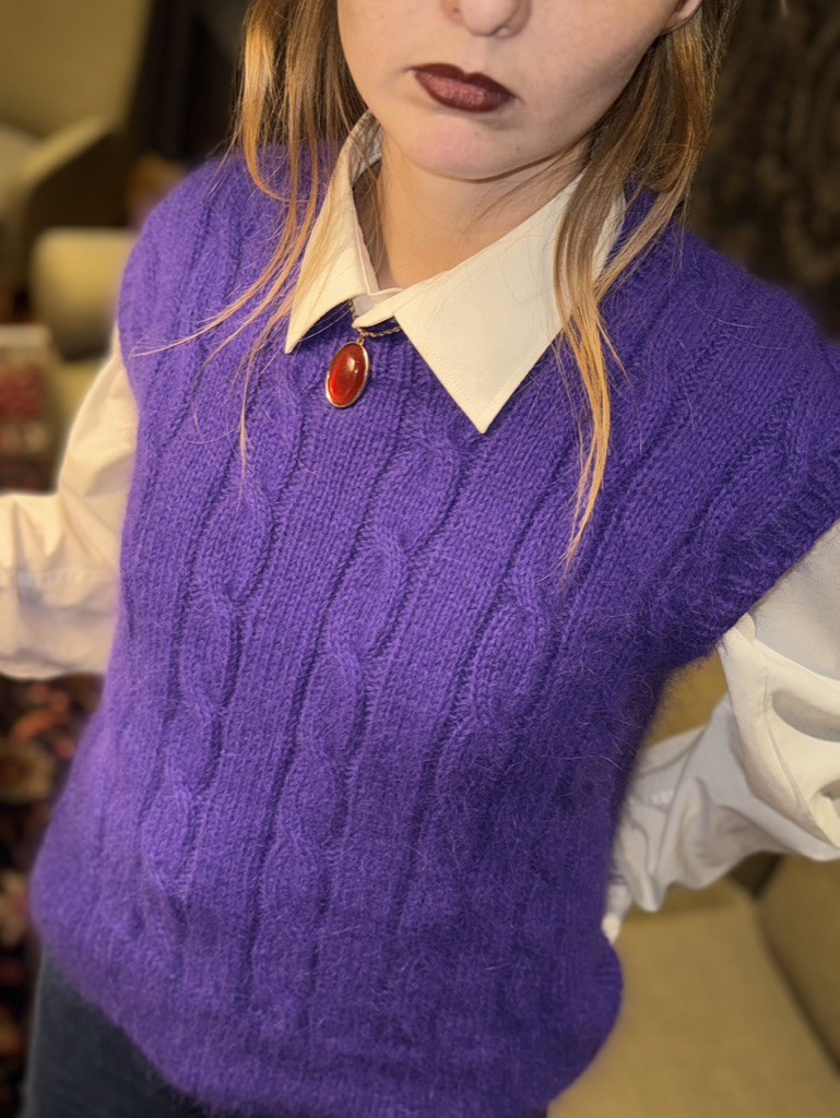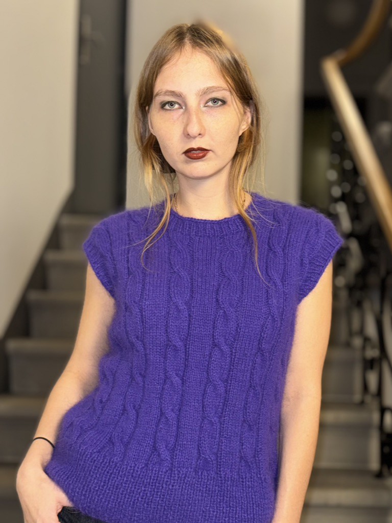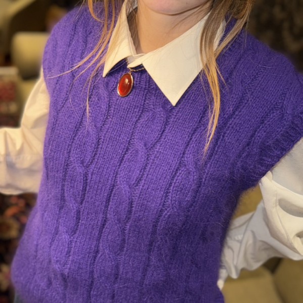 Ar rokām adīta angoras vilnas veste skaistā violetā tonī. Šī veste ir mīksta, viegla un īpaši silta, tāpēc lieliski piemērota valkāšanai vēsākā laikā. Klasiskais pīņu raksts piešķir elegantumu un pārlaicīgu noskaņu, padarot to piemērotu gan ikdienas, gan izsmalcinātākiem tērpiem.