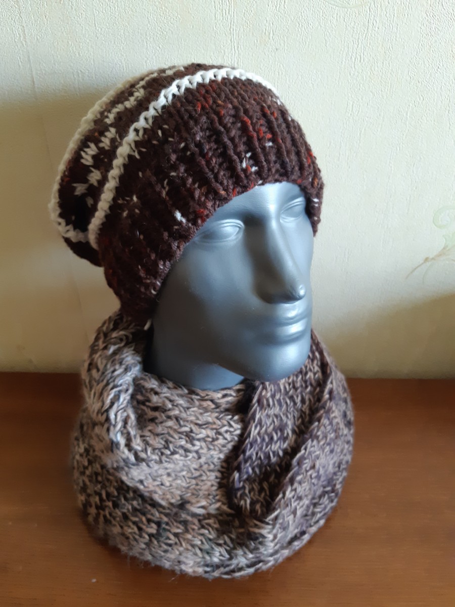No tvīda dzijas (40%) adīta mīksta cepure un apaļšalle .Šallei izmantota dažādu brūno toņu dzija (70% vilna).