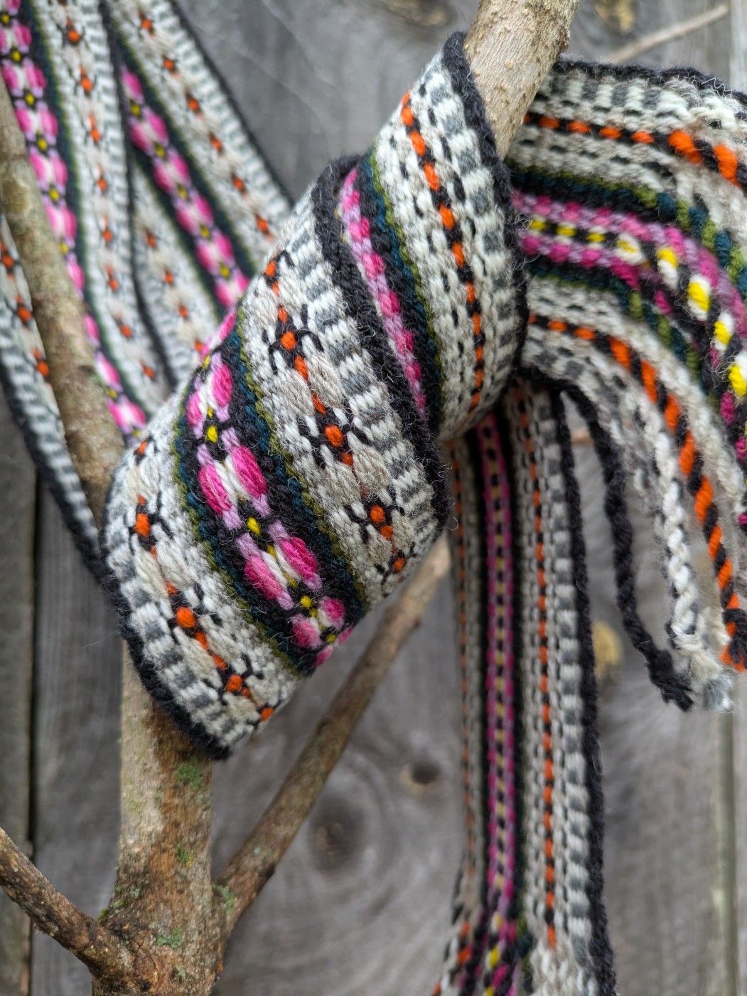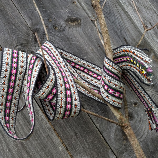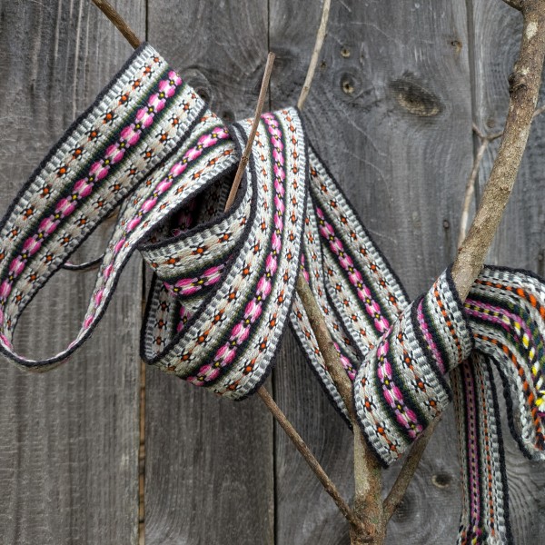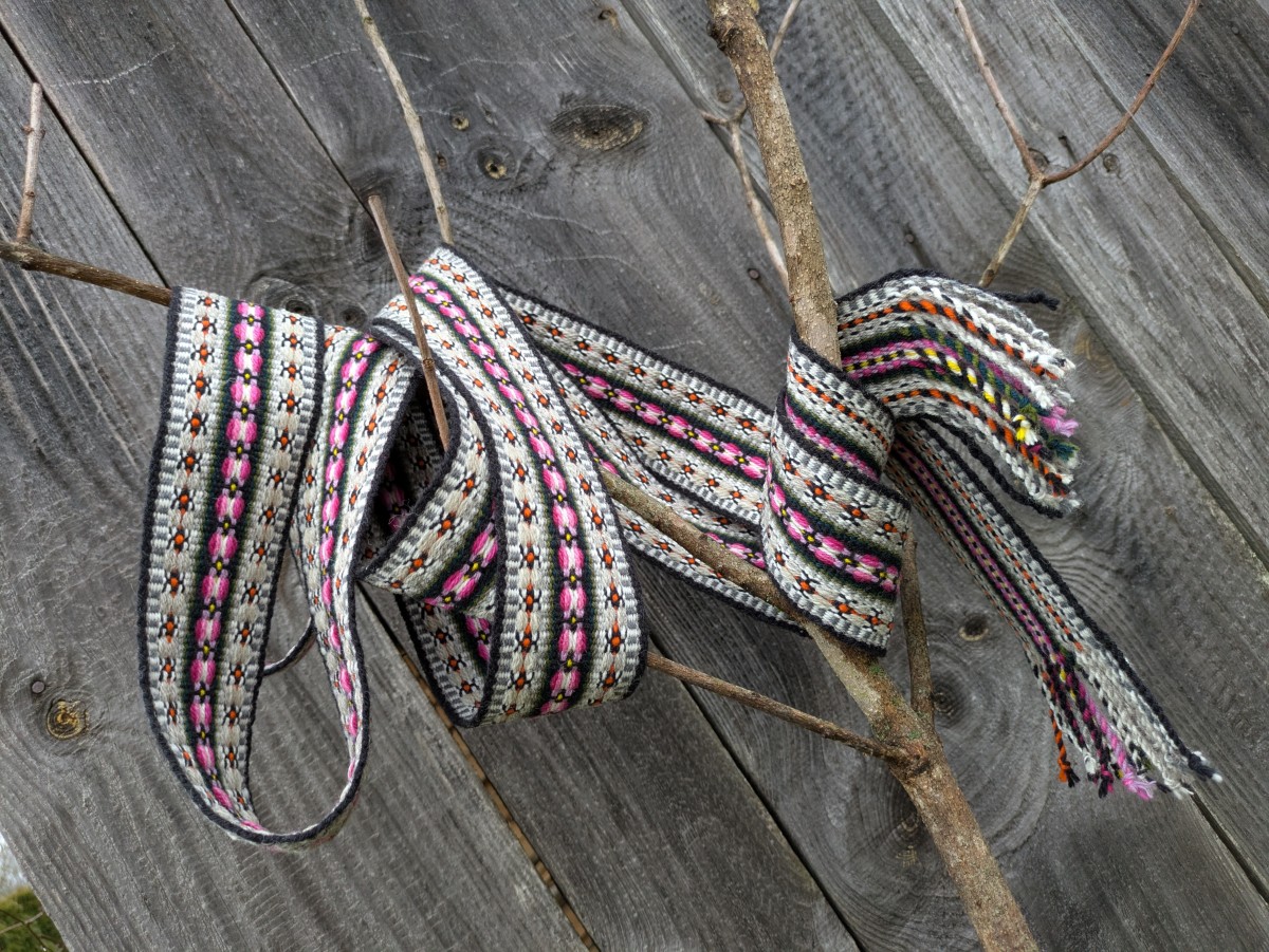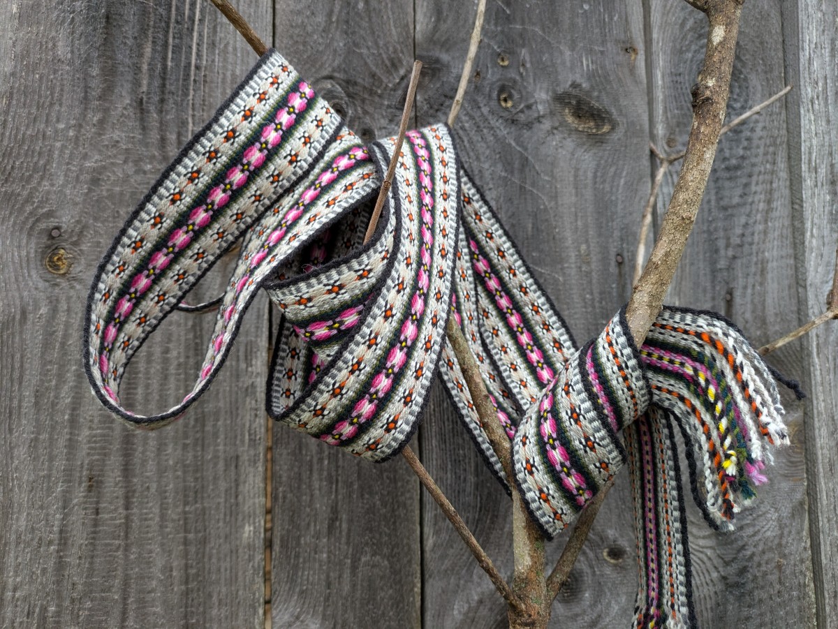 Austa tautiskā ziedainā josta ,,Vidzemes vijolītes" paraugs no Priekuļu dejotājiem.