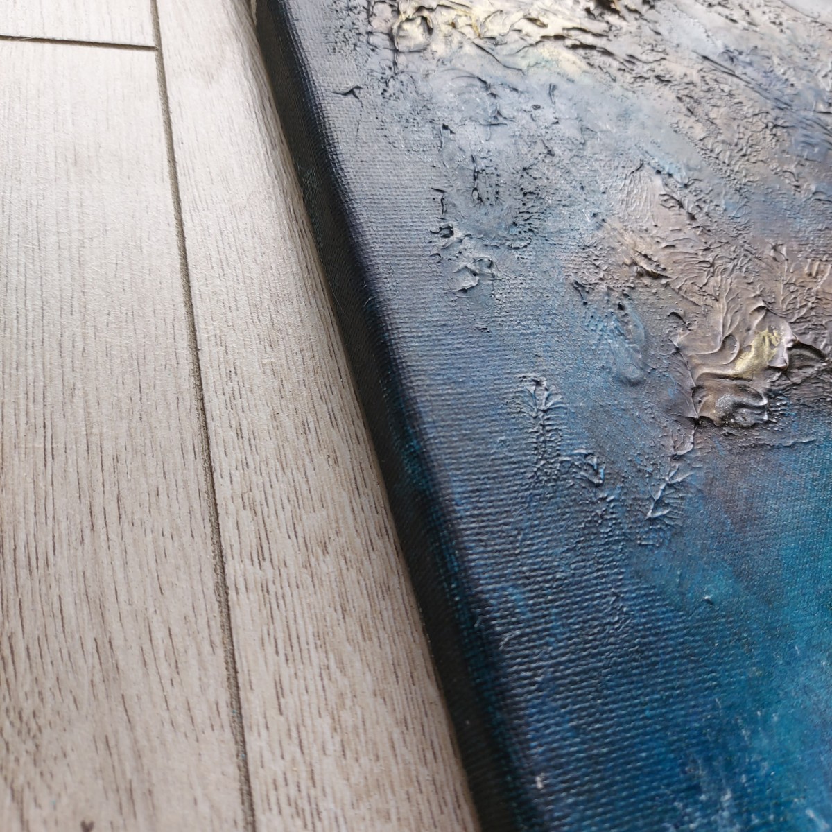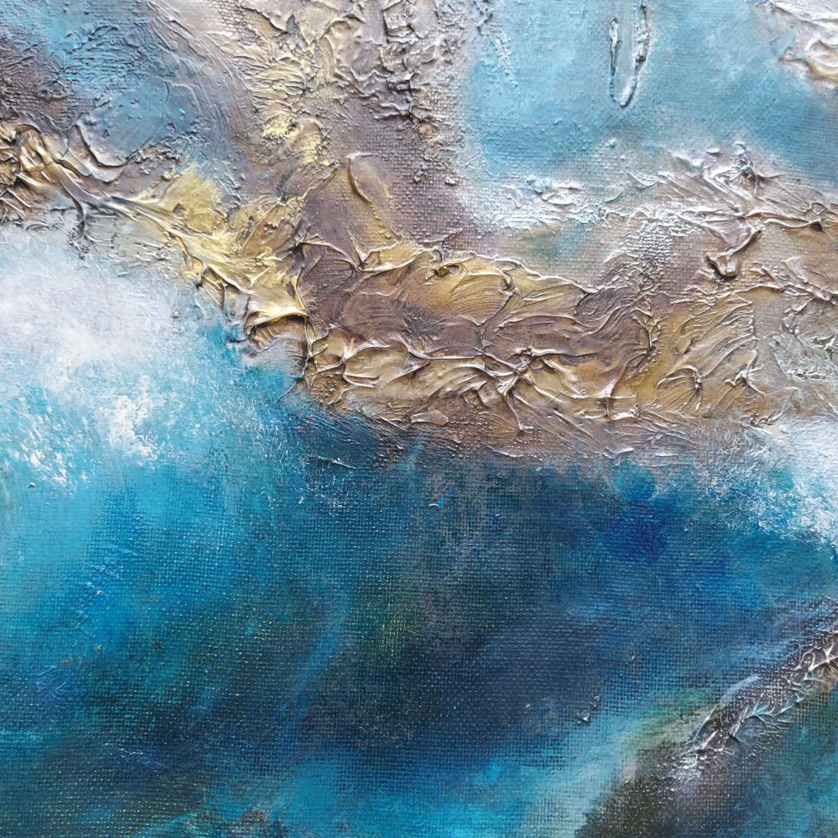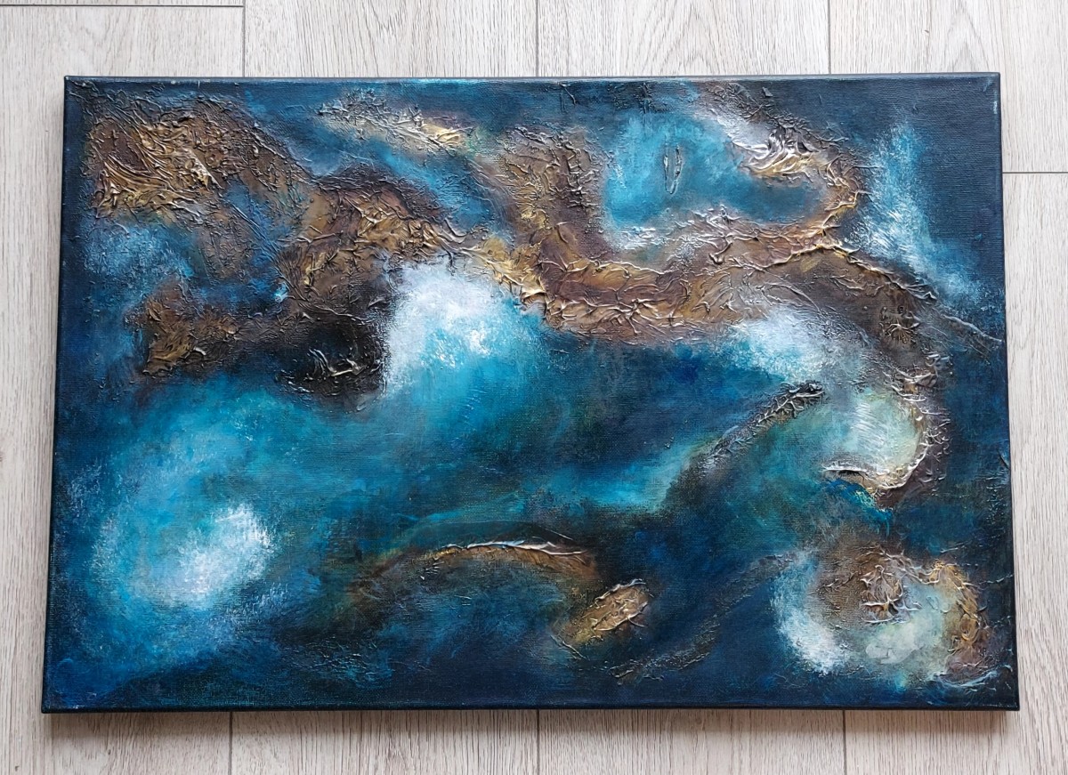 Dziļi zilie un tirkīza toņi apvienoti ar faktūrām un zeltainiem, zemes krāsu akcentiem, radot dinamisku un telpisku kompozīciju.