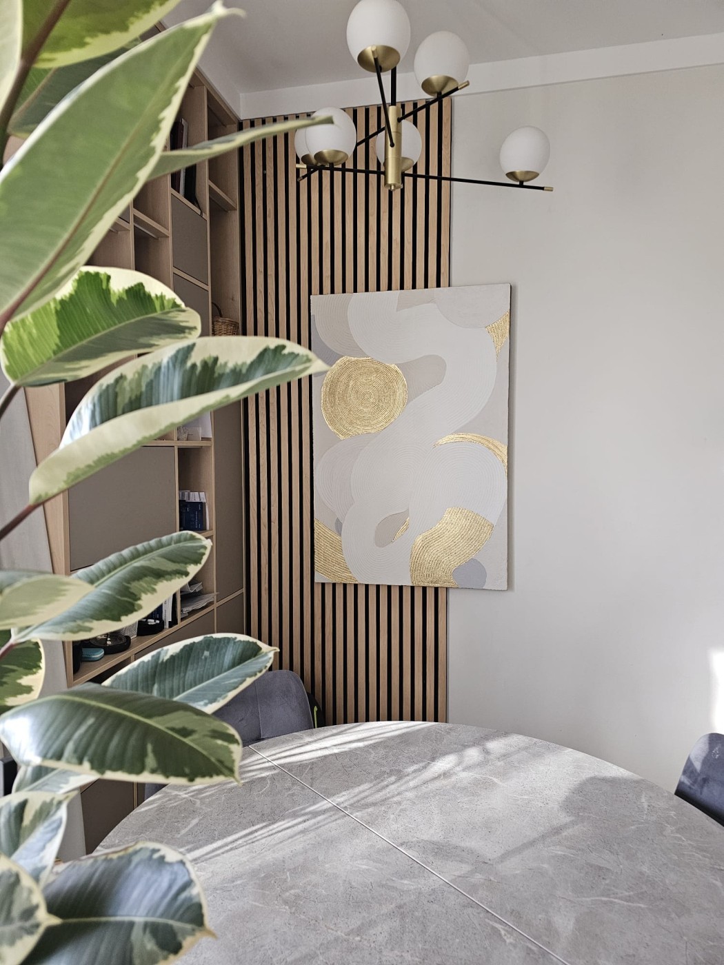 Pārdodu oriģinālu faktūras gleznu elegantos baltos un zelta toņos. Šis darbs interjerā ienes gaismu, mieru un izsmalcinātu estētiku. Reljefā virsma un ritmiskās līnijas rada telpā dziļumu un kustību, savukārt zelta akcenti piešķir gleznai siltumu un vieglu greznības sajūtu.