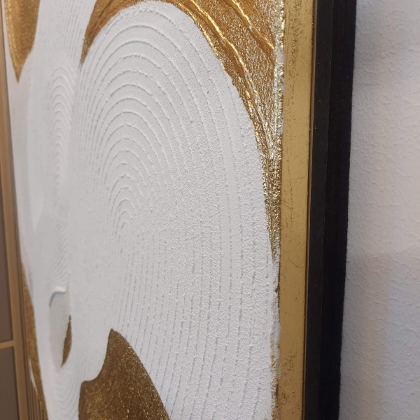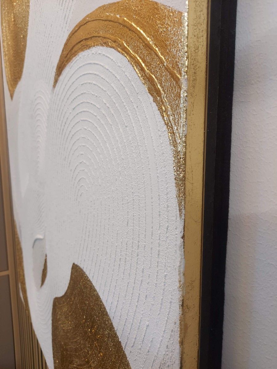 Faktūras abstrakta akrila glezna baltos un zelta toņos, 120 × 80 cm