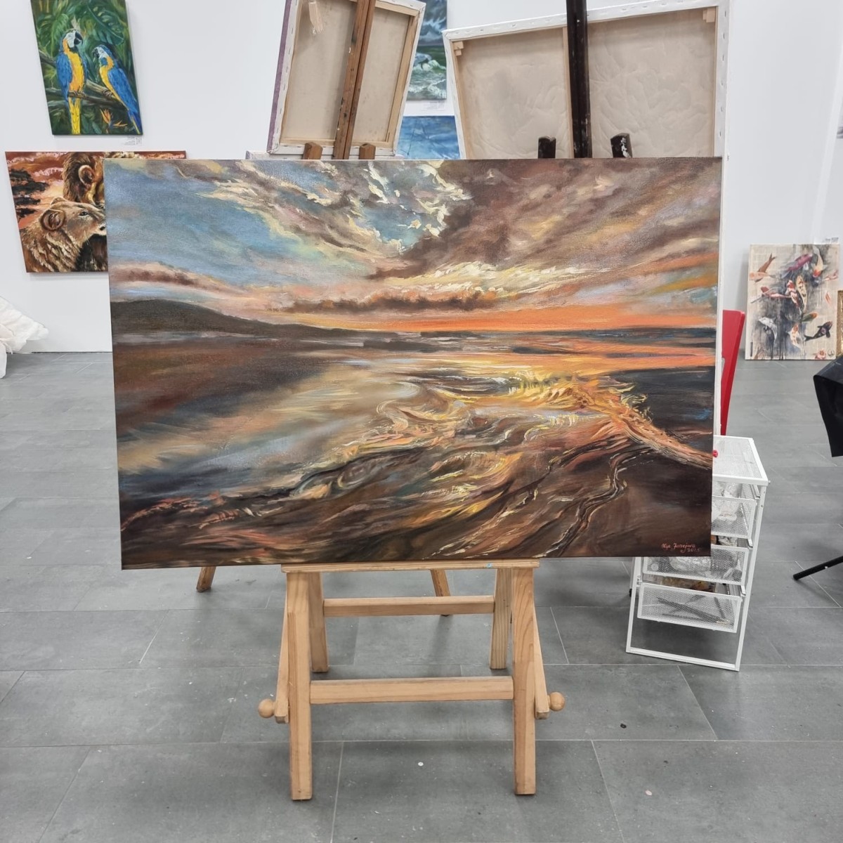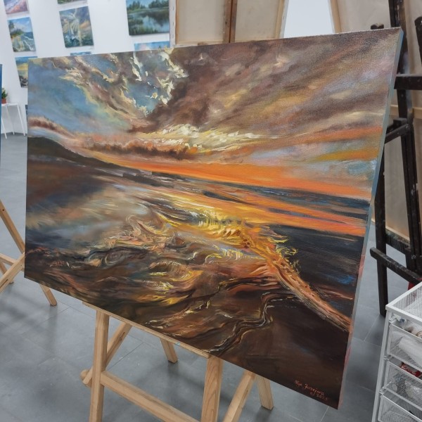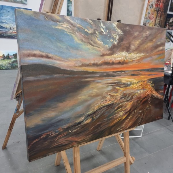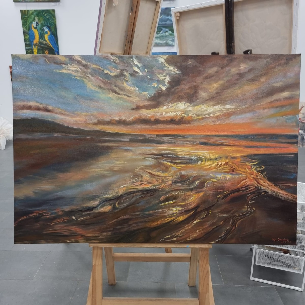 Šī glezna (70×100 cm, eļļa uz audekla) tapa izstādes laikā Saga centrā. Tā sevī iemieso jūras kustību, saulrieta gaismu un to mirkli, kad daba sarunājas ar cilvēku.