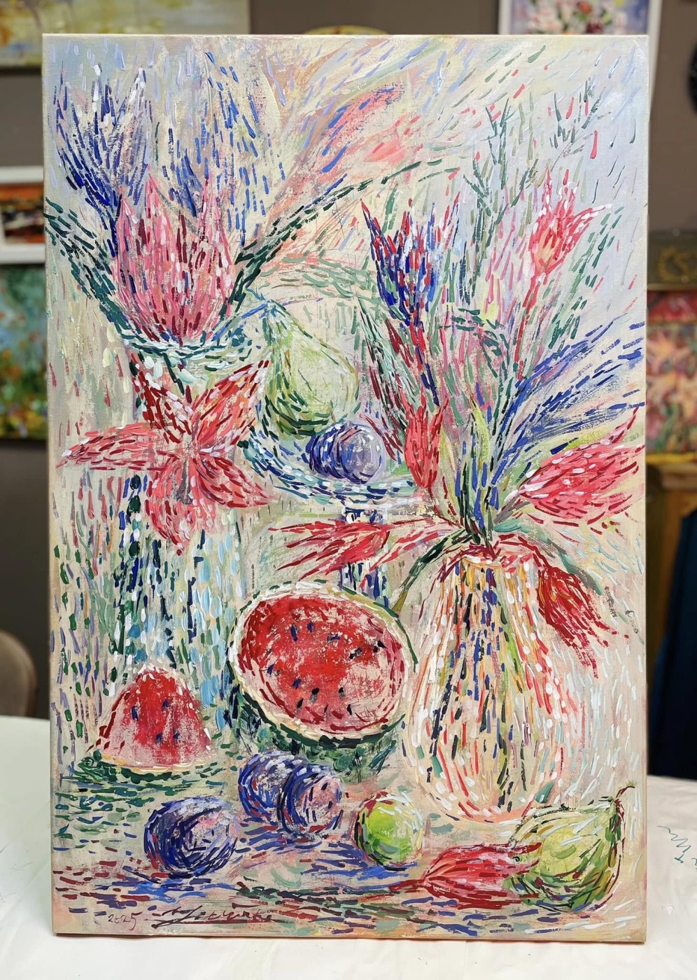 Klusā daba ar arbūzu un ziediem 🎨90x60cm