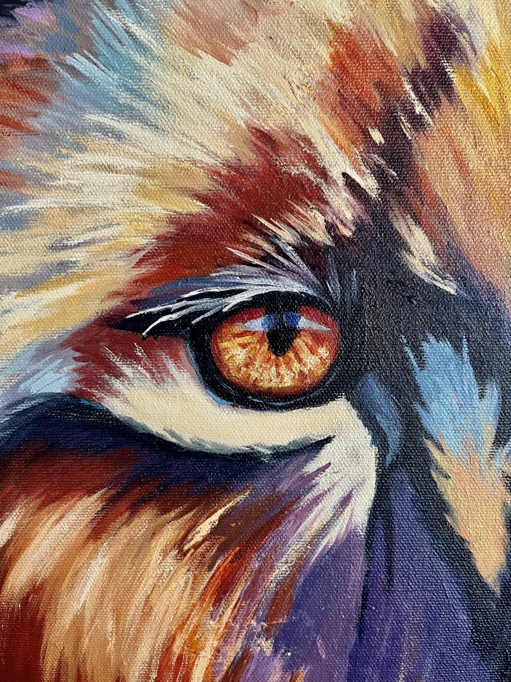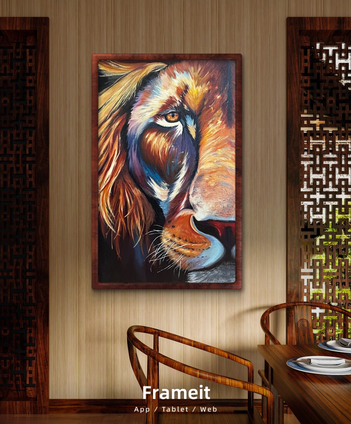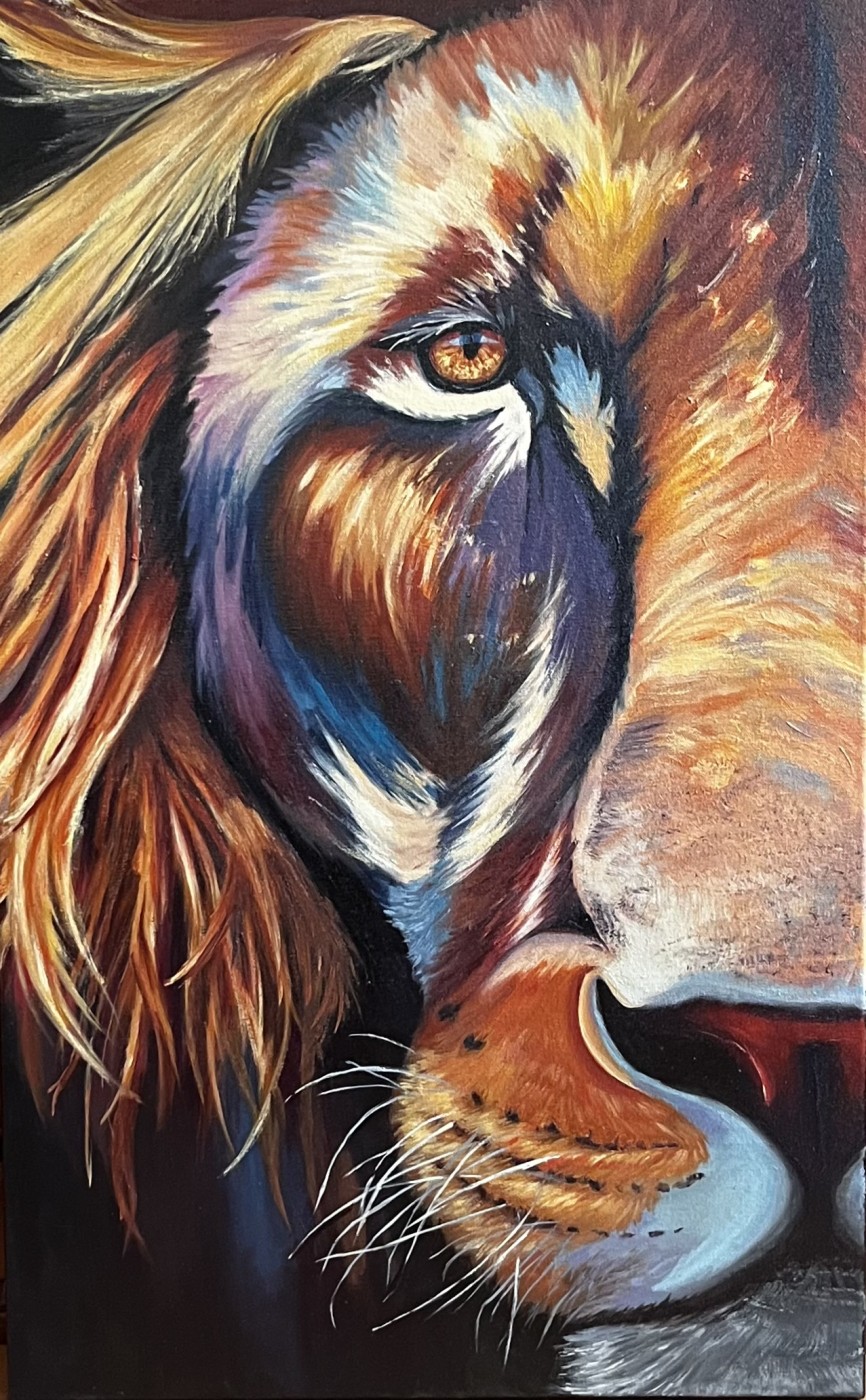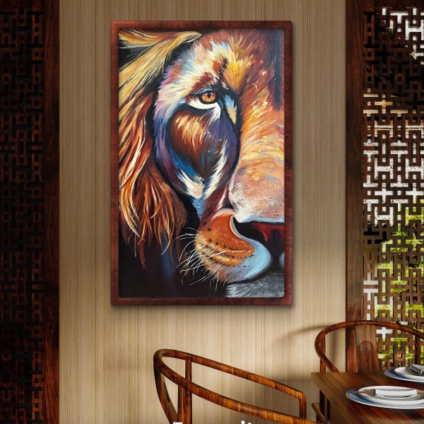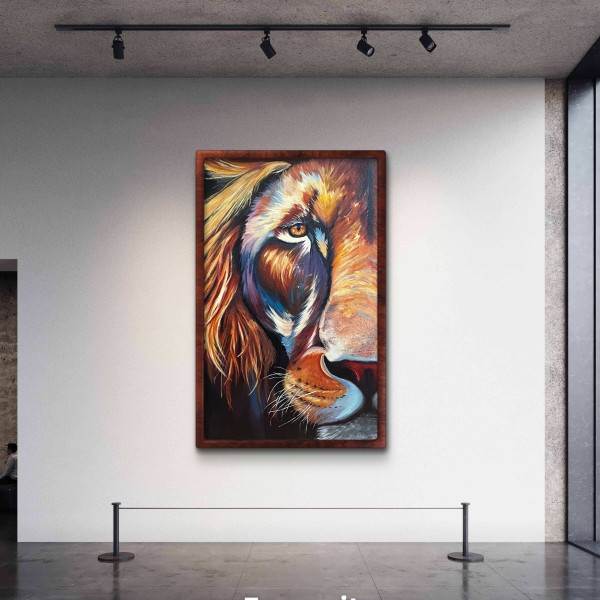 Krāsains darbs. Dažos vietas zem krāsas spīd zelta folijā, kas padara gleznu vēl dzīvīgāk.