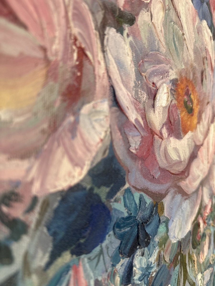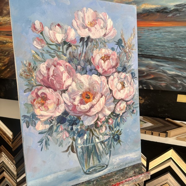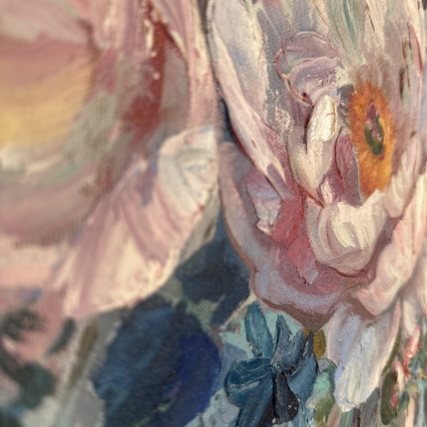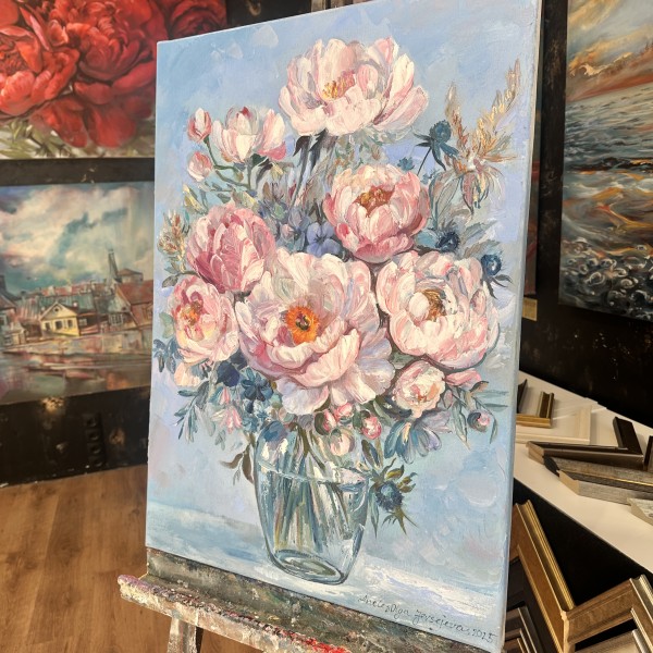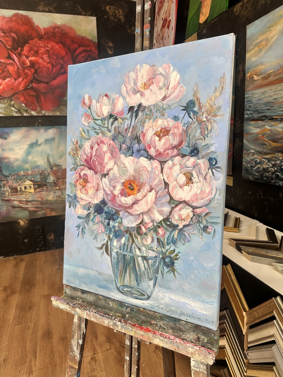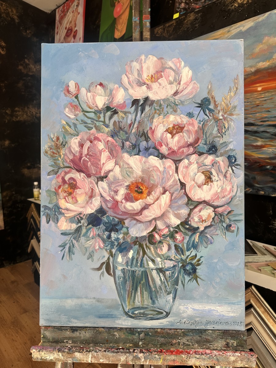 Šī oriģinālā glezna ar peonijām ir radīta eļļas tehnikā ar izteiktu, dzīvu otas triepienu.
