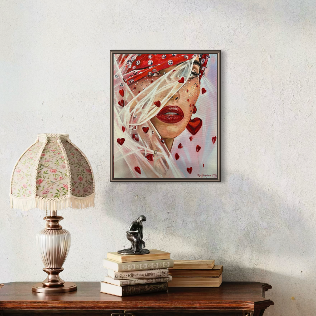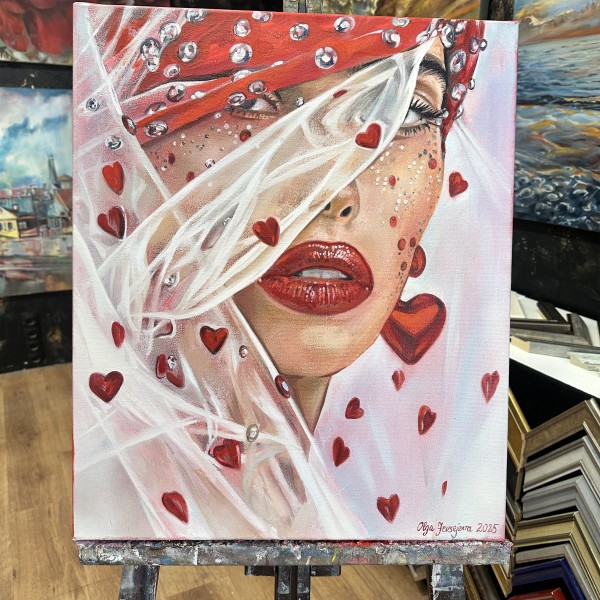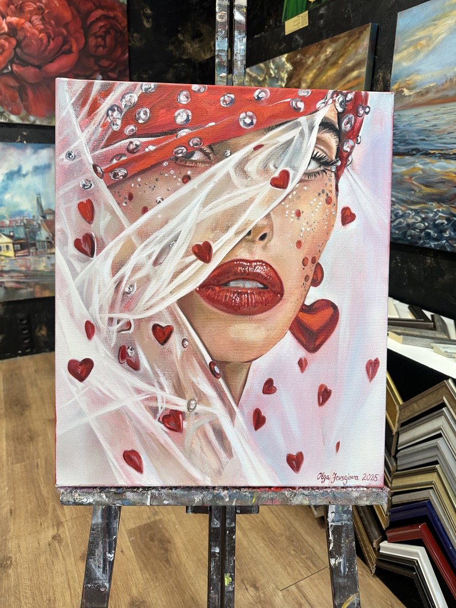 Sarkanās krāsas akcenti simbolizē mīlestību un enerģiju, bet daļēji aizsegtās acis rada intrigu un dziļumu — skatītājs tiek ievilkts gleznas noskaņā un interpretācijā.