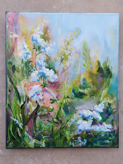 Glezna ar vasaras atmosfēru. Pļavas ziedi un maigie madaras ziedi. Skaisti apvienoti caurspīdīgie slāņi ar bieziem trepieniem. Glezna pārdota, iespējams pasūtīt līdzīgu
