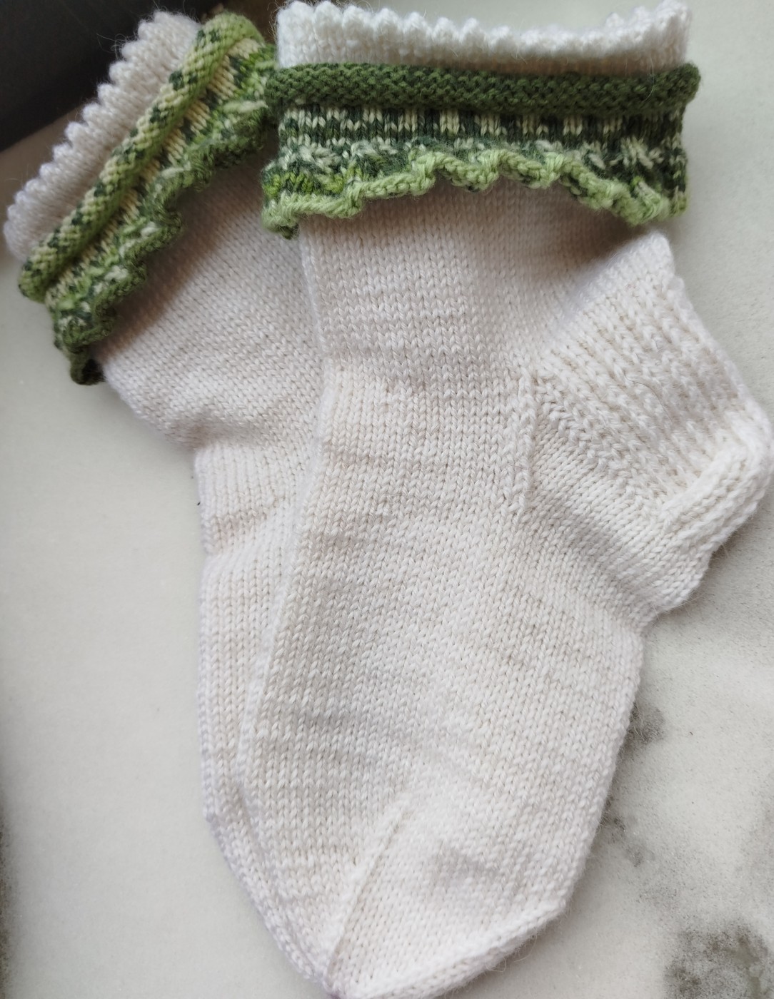 Ar lielu pacietību, neatlaidību, sirdssiltumu, precizitāti un mīlestību ar rokām adītas zeķes.Zekes ar skaistu atloku, zaļā krāsā volaniņu.Loti labs akcents.